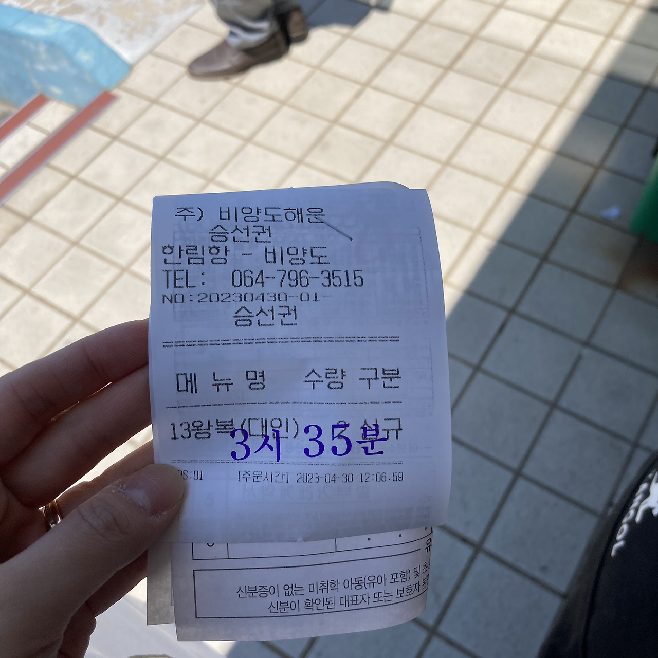 것을 발견하게 되었고 그 자리에서 1시간 반 출항 배를 끊었다. 우리 뒤로 3명을 더 받고 1시간 30분 차는 마감이 되었다.
