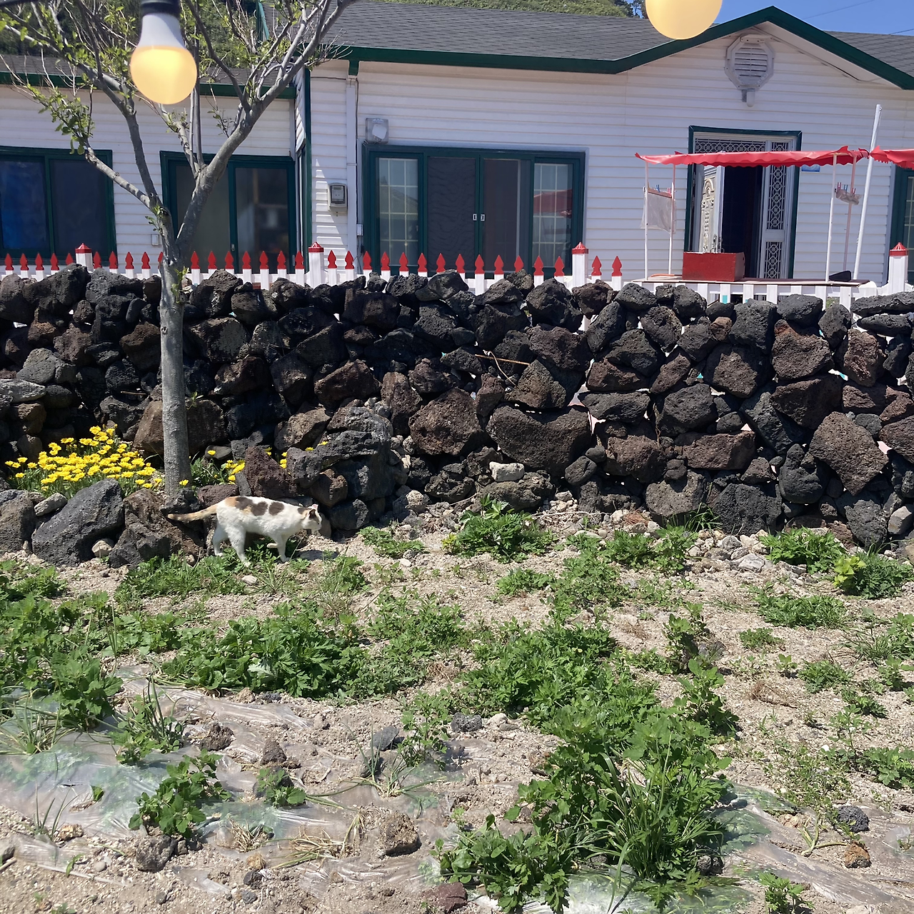 우리는 허기가 져 섬구경을 먼저할지, 식사를 할지 고민을 하며 어슬렁거리다가, 우리처럼 어슬렁거니는 고양이가 있는 가게에 눈길이 갔다. 메뉴판에 라면이 보였다. 확 구미가 당기었다. 친구도 보말 칼국수를 먹어본 적이 없어 먹어보고 싶다는 말에 우리는 바로 그 자리에서 비양도를 다 못 돌더라도 식사를 하기로 결정하였다. 햇빛은 따시고, 산들바람은 불고, 공간은 톽 튀어져 있고, 정원이 꾸려져 있는 그 공간에서는 우리는 새소리를 들으면서 식사를 했다. 식사를 하면서 우리는 '와- 이거면 이미 비양도에서 할 거는 다했다.'며 포만감에서 행복감을 꼈다. 비양도를 다 못 돌 수도 있지 생각하곤 3가지 선택지 중 골랐다.