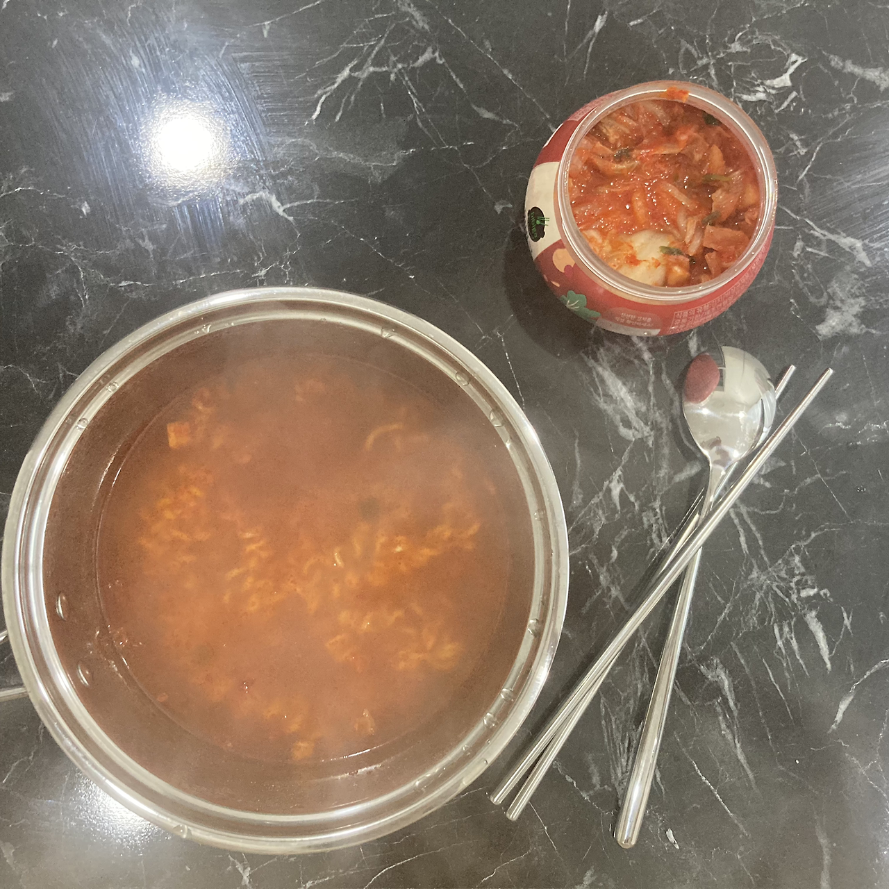 그런데 이 큰 화구도 인덕션은 처음이라 그런가 뭔가 익숙치 않아 답답함이 있지만 라면을 끓여본다. 밥도 먹고 싶은 생각에 라면을 반만 넣고, 끓인다. 엄마가 해준 김치는 아니지만 다행스럽게도 내 입맛에 맞는다. 때때로 음식집에서 나오는 맛없는 김치는 안 먹는 만 못하다.