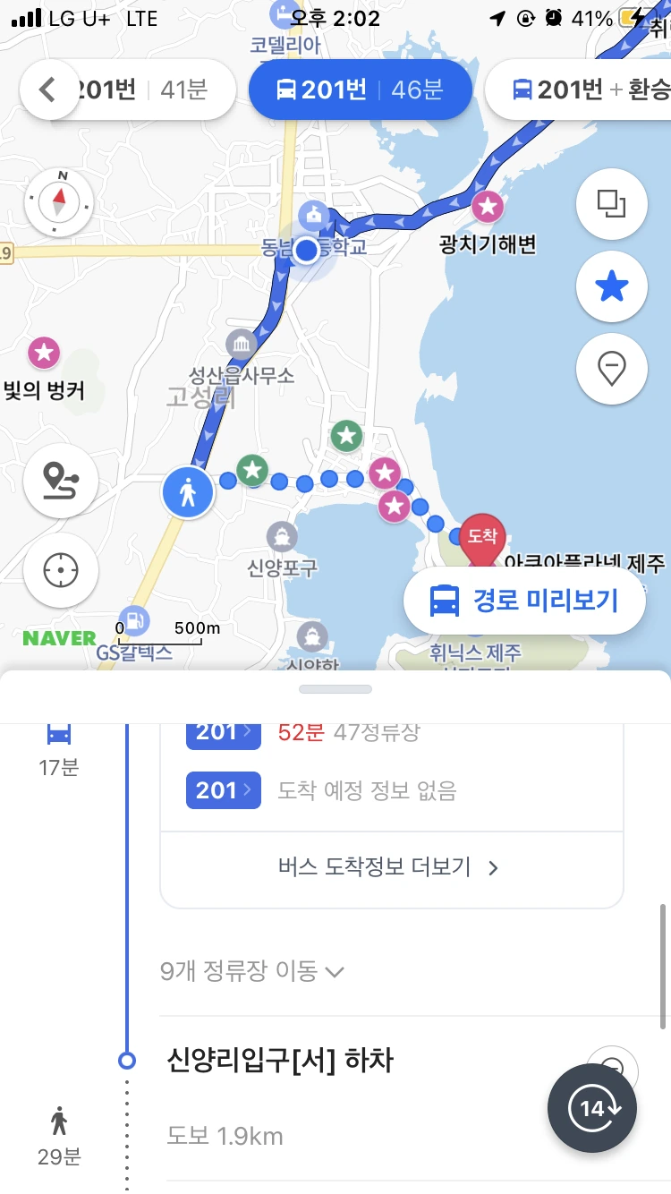 막상, 그래도 안 왔으면 아마 내 성격에 아쉬워했을 것이다. 힘이 든다. 생수를 다 먹었다. 그러고 보니 제주도 한달살이를 하면서 이동할 때 물을 가지고 다니는 데, 이 물을 다 먹어본 것도 오늘이 처음이다. 오늘 참 모자가 젓도록 땀을 빼고 물도 다 먹고, 나 고생이 참 많다. 쉴 수 있는 구간에서 쉬다가 경로검색을 해보았다.
