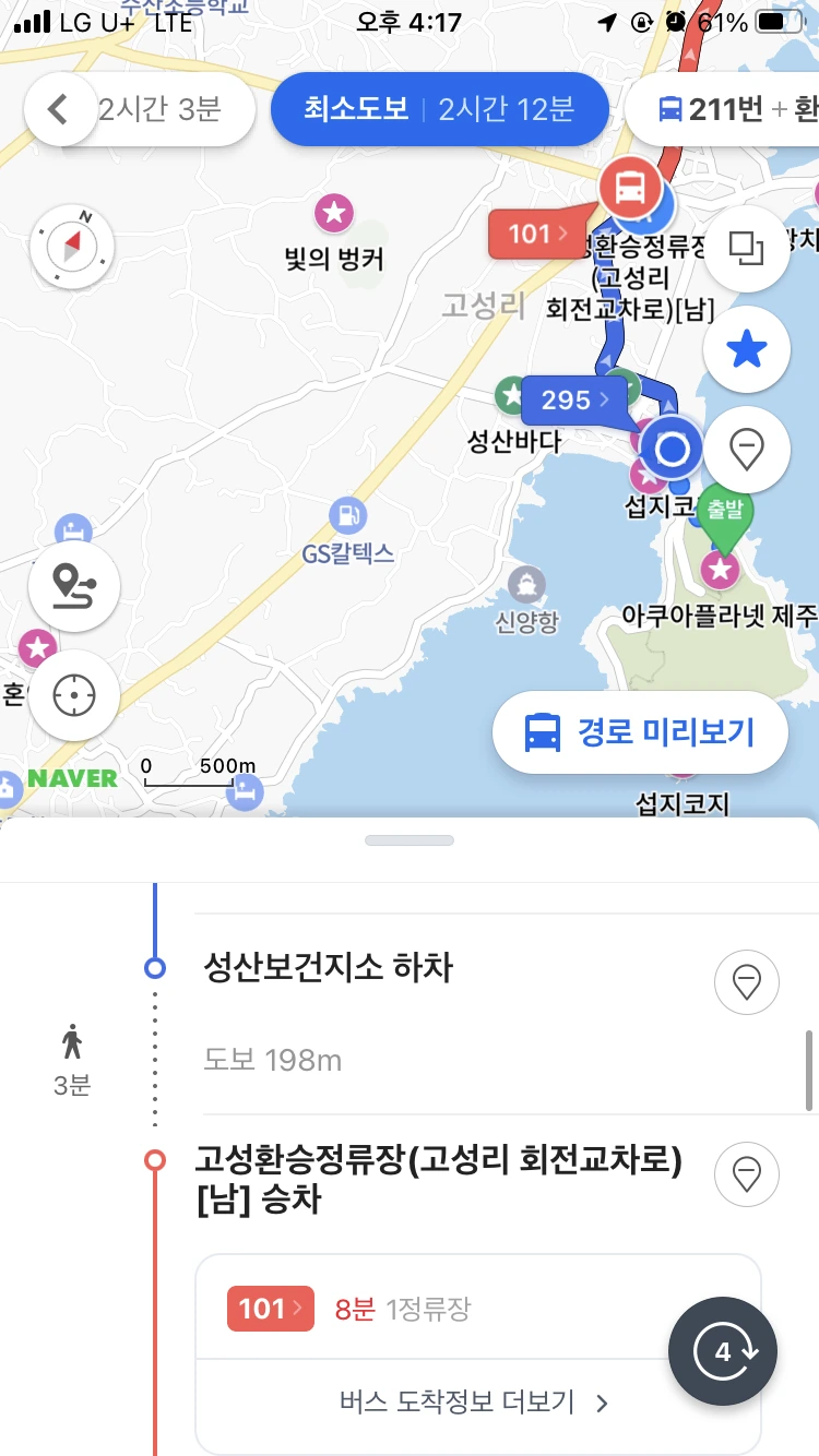 살짝 몸이 안 좋은 것 같다는 느낌이 든다. 최대한 적게 움직여야겠다는 생각으로 광치기해변은 빠르게 머릿속에서 삭제하였지만, 그 정류장을 지나갈 때는 아쉬움이 있었다. 아쿠아리움, 광치기해변, 섭지코지 중 고민했었다. 생각들이 지나갔다. 어떤 곳을 가야 할지 섭지코지는 가고 싶은 곳이기는 하나 어제 조사한 반에 의하면, 뚜벅이 족이 가기 힘든 곳으로 입장권을 냈다고 생각하고 택시를 타고 안에 들어가도, 나오기는 힘들고 3시 전에는 나와야지 안전하다는 글을 보아서 선택지에서 가장 후순위였다.