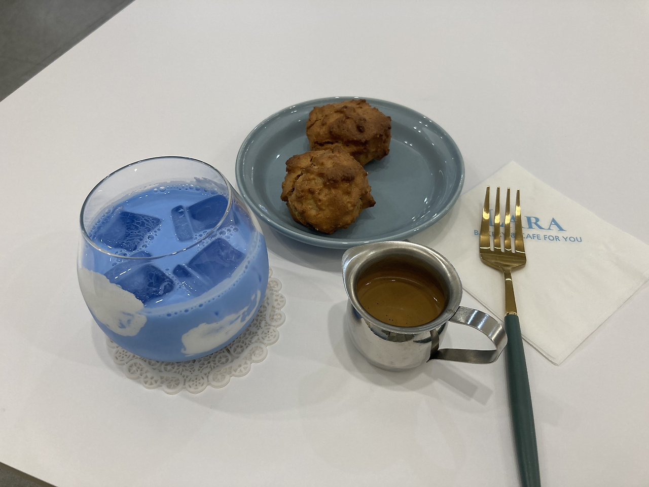 역시나 나는 이곳의 시그니처 메뉴인 구름라테를 주문했다. 파란색 우유가 특징이다. 아침에 치킨을 먹고 나와서 디저트로는 호두뭉치(?) 같은 것을 주문했다. 제주도 한달살이 중 밥을 포기하더라도 하고 싶은 것 중에 하나가. 그곳의 디저트도 주문하는 것이다.