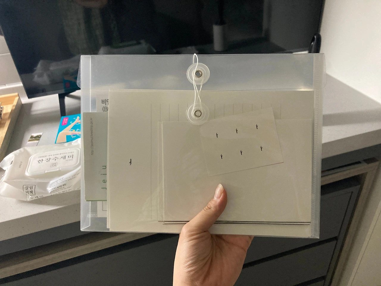 여기서 소소하게 굿즈를 사고 싶다. 집에 와서 보니 엽서 세트인 줄 알고 구입했던 것은 알고 보니 편지세트였지만 스스로 당황했지만 너무 신나서 소비 욕구가 왔나 보다. 이런 편지를 써야 하나? 언젠가는 쓰겠지 하며 패키지 안에 제주도 예매권과 방문 티켓을 넣어둔다. 다시 만족스럽게 본다. 이거 제주 편집물 스크랩물 봉투가 되었군. 제주 냄새가 나는 것 같다.