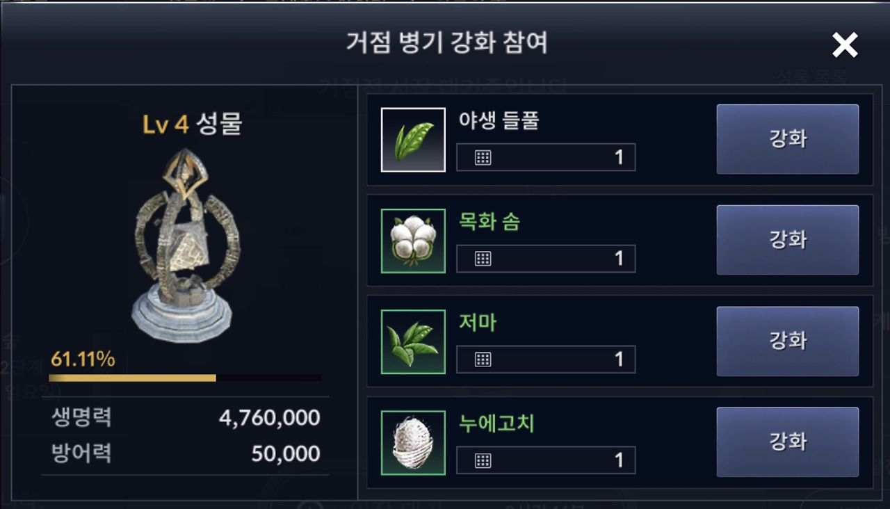 자원은 개인의 영지 자원을 활용해서 강화 하는 것이므로 자발적 부담되지 않는 수준에서 여러 사람들이 참여해서 강화 하는 것이 중요 합니다.