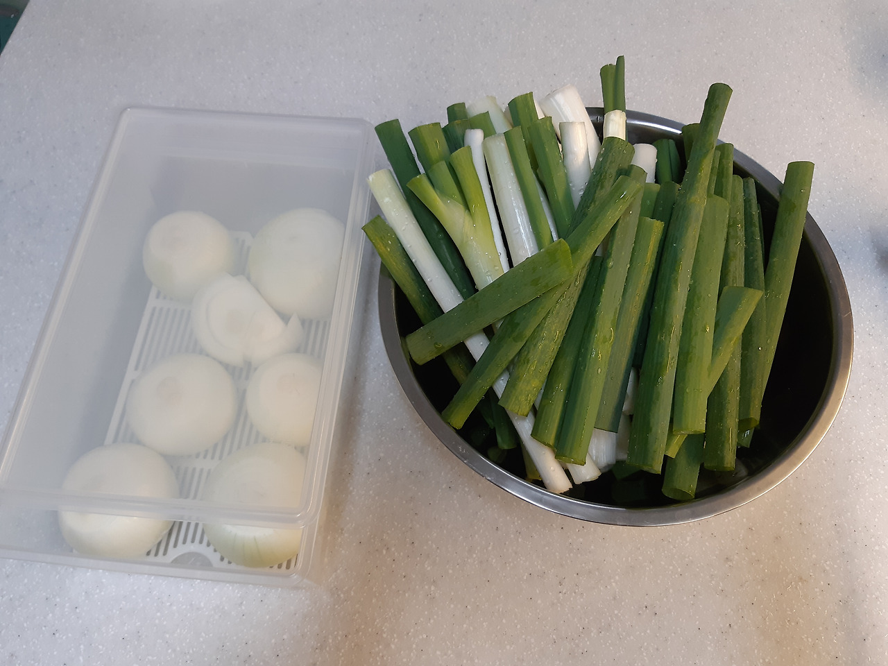 양파, 대파는 항상 우리 집 요리에서 빠지지가 않는다. 그래서 떨어지지 않게 항상 구비하는 편인데, 양파와 대파를 사면 꼭 다 쓰지 못하고 버리는 일이 많았다. 그러던 중 마트에서 깐 양파, 손질 대파를 파는 것을 보고 우리 집도 마트를 따라 하기 시작했다. 양파를 한 망 사 오면 사 오자마자 다 까서 깨끗하게 씻은 후 말려서 냉장고에 보관한다. 그리고 대파도 사 오자마자 다 자른 다음 물에 씻어서 말린 후 냉장고에 넣는다. 이렇게 한 번 작업해두면 요리 시간이 아주 많이 단축이 된다.