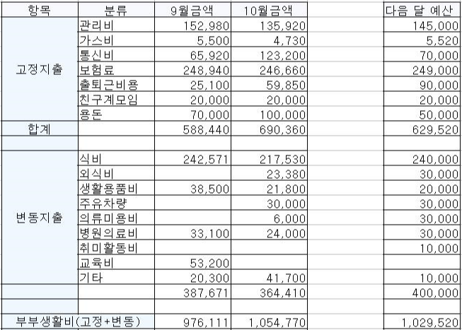 10월 변동지출 목표를 아이 없는 부부 2인 40만 원으로 잡고 생활했다. 결과는 35,590원을 남기고 성공! 계획은 5만 원을 남기고 싶었는데 5만 원까지 남기는 것은 아직은 그 경지까지는 가지 못했다.