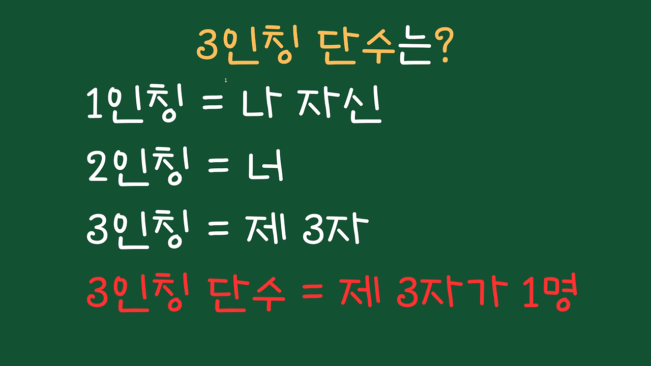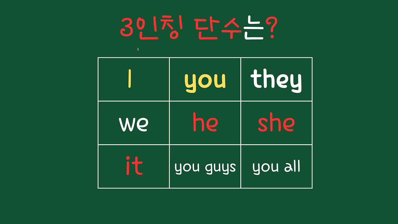 첫 번째로 동사에 ‘s’가 붙는 경우는 하려는 말의 문장의 주인공이 ‘3인칭 단수’ 일 때입니다. 1인칭은 나, 2인칭은 너, 그 외는 전부 3인칭입니다. 3인칭 단수는 제3자가 1명 일 때만 해당됩니다. 2명 이상이면 해당되지 않습니다. 주어자리에 올 수 있는 단어는 I, you, she, he, we, they, it 등이 대표적으로 있습니다.
