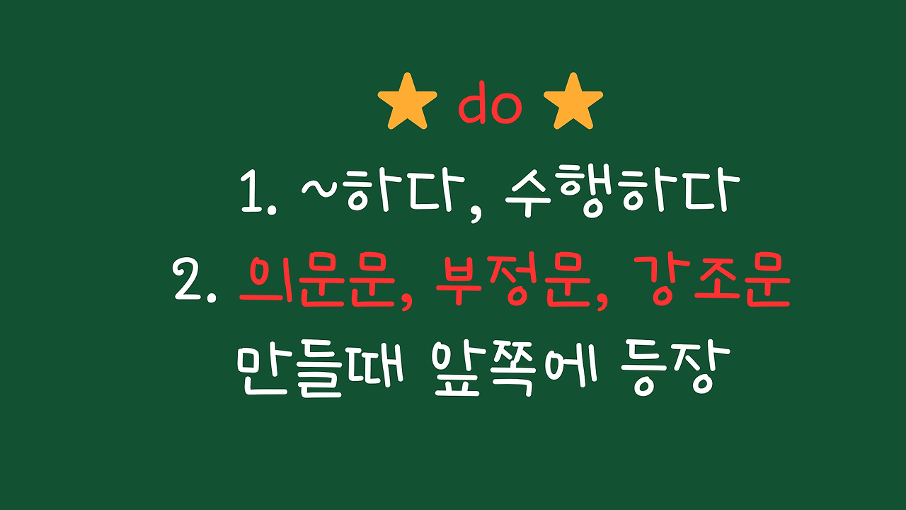 do라는 특이한 녀석은 do homework, do laundry 등 ‘하다, 수행하다’라는 평범한 동사이기도 하지만 의문문, 부정문, 강조문을 만들 때도 등장합니다. do - did - done