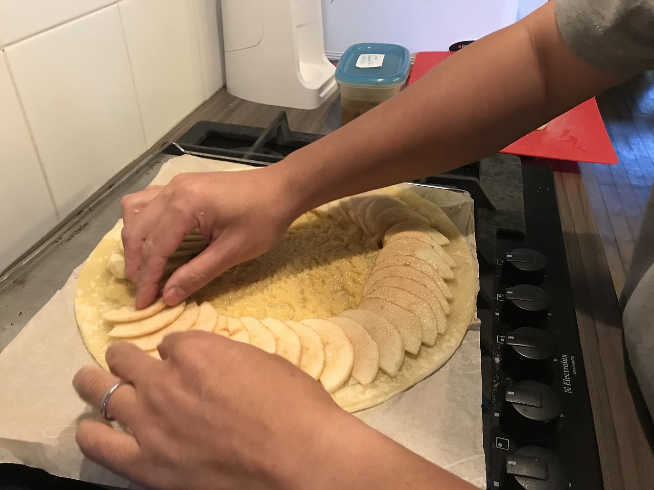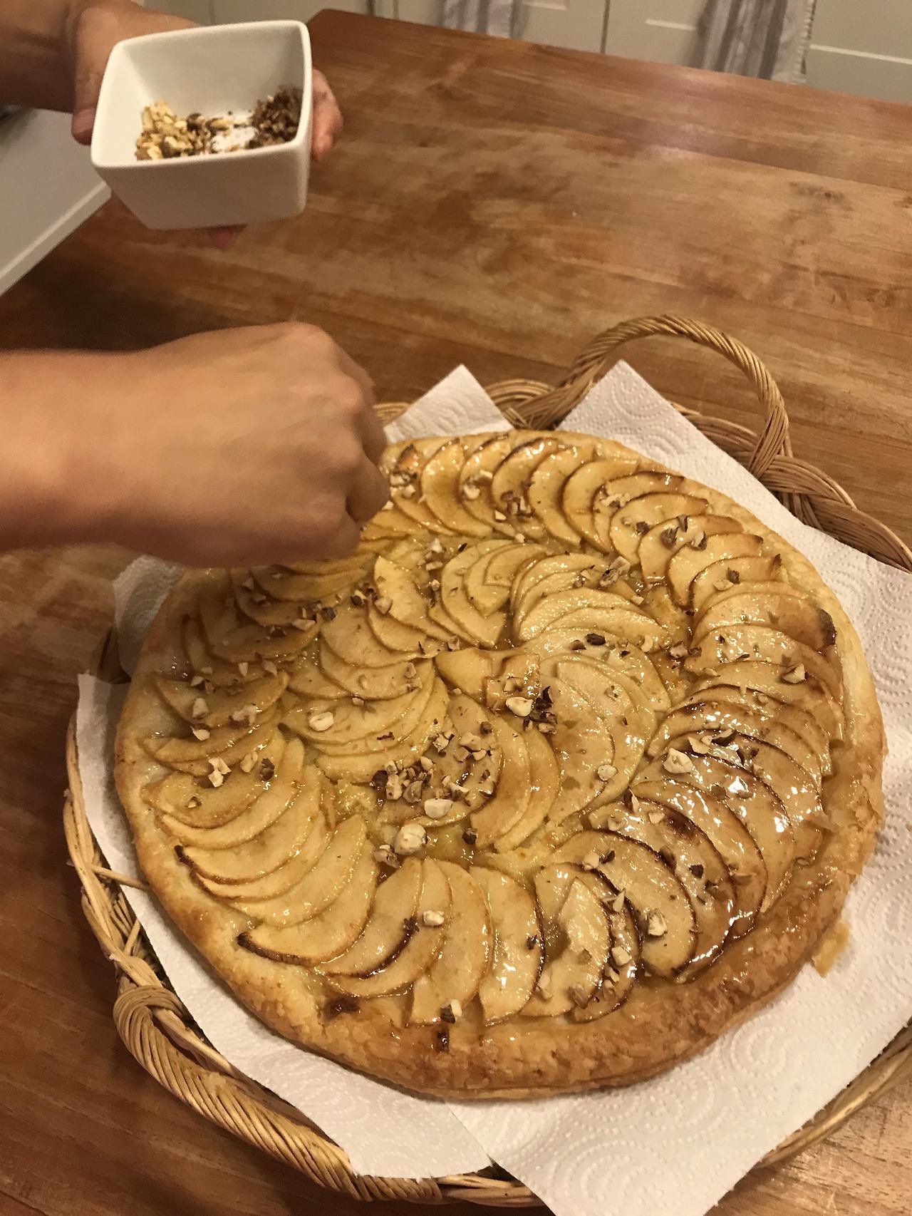 남편도 사과 껍질을 벗기고 자른 후 반죽 위에 얹으며 열심히 파이를 만든다. 파이는 어느새 향긋한 냄새를 풍기며 오븐에서 나왔다. 오븐에서 이제 막 나온 파이에 뿌린 살짝 볶은 헤이즐넛의 달콤한 향이 사과의 상큼함과 섞이며 자연스레 파이에 스며 들어갔다. 모두들 감탄을 반복하며 먹었다. 남편의 손에 들어가면 그 어떤 재료도 훌륭한 요리가 되어 나오지만, 이제 막 떨어진 사과와 헤이즐넛으로 만들었는데 맛있지 않을 수 없었다.