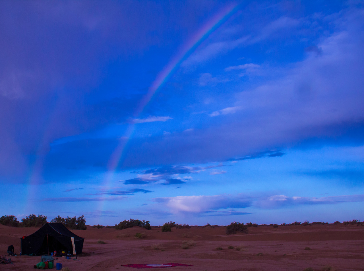 사막에서 이토록 아름다운 무지개를 볼 줄은 상상도 못 한 일이었다. 나는 이때 처음 알았다. 사막에도 비가 내리고 무지개가 핀다는 사실을. 그리고 그 무지개가 사라지면 모래에 떨어진 빗방울들로 이 척박한 사막에도 생명이 싹튼다는 것을. 어느새 무지개는 두 겹이 되어 우리의 텐트 뒤 사막 하늘에 걸쳐 있었다.