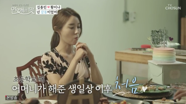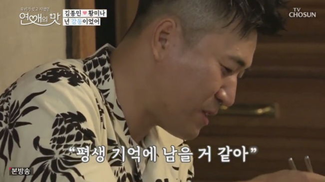 그건 연애 리얼리티 프로에서 이미 몇 번이나 등장해서 조금은 식상하기까지 한 생일상 차리기 이벤트에 감동해서가 아니라 전혀 예상치 못한 김종민의 반응 때문이었다. 늘 방송에서 가볍고 장난기 많은 '바보 형'의 이미지로 보였던 전문 예능인인 그가 막상 자신을 위해 차린 음식들 앞에서 거의 아무 리액션도 하지 못하고 먹고만 있었다.
