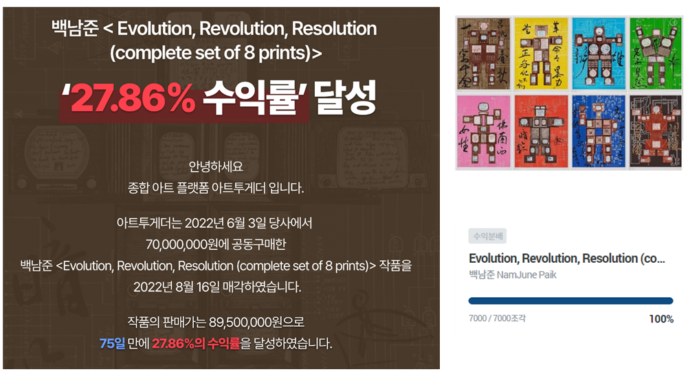 하나만 더 볼까? 미술품 조각 투자 플랫폼 아트투게더는 미술품에 대한 소유권을 조각내서 판매하고 있어. 아래처럼 국내 유명 작가인 백남준 작가의 작품을 7,000조각으로 나눠서 1조각당 1 만원에 판매했지(총 70,000,000원). 그리고 이 작품은 후에 89,500,000원에 매각돼서 1조각당 27.86% 정도의 수익률을 달성했어.