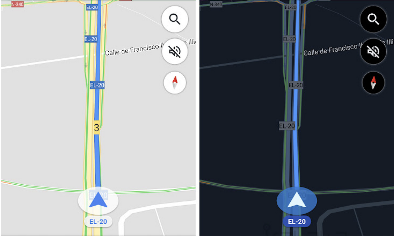 삽화와 반투명도가 주변 색상에 어떤 영향을 미치는지 고려하세요. 삽화의 변형으로 인해 주변 색상이 변경되는 경우가 있습니다. 사용자의 시각 연속성을 유지하고, 인터페이스의 요소가 너무 부각되지 않게 하는 것이 좋습니다. 예를 들어 지도는 지도 모드에서 밝은 색상을 보여주지만, 위성 모드에서는 어두운 색상으로 전환합니다. 색상은 툴 바(toolbar)와 같은 반투명 요소 뒤에 배치되거나 적용될 때 다르게 나타날 수도 있습니다.
