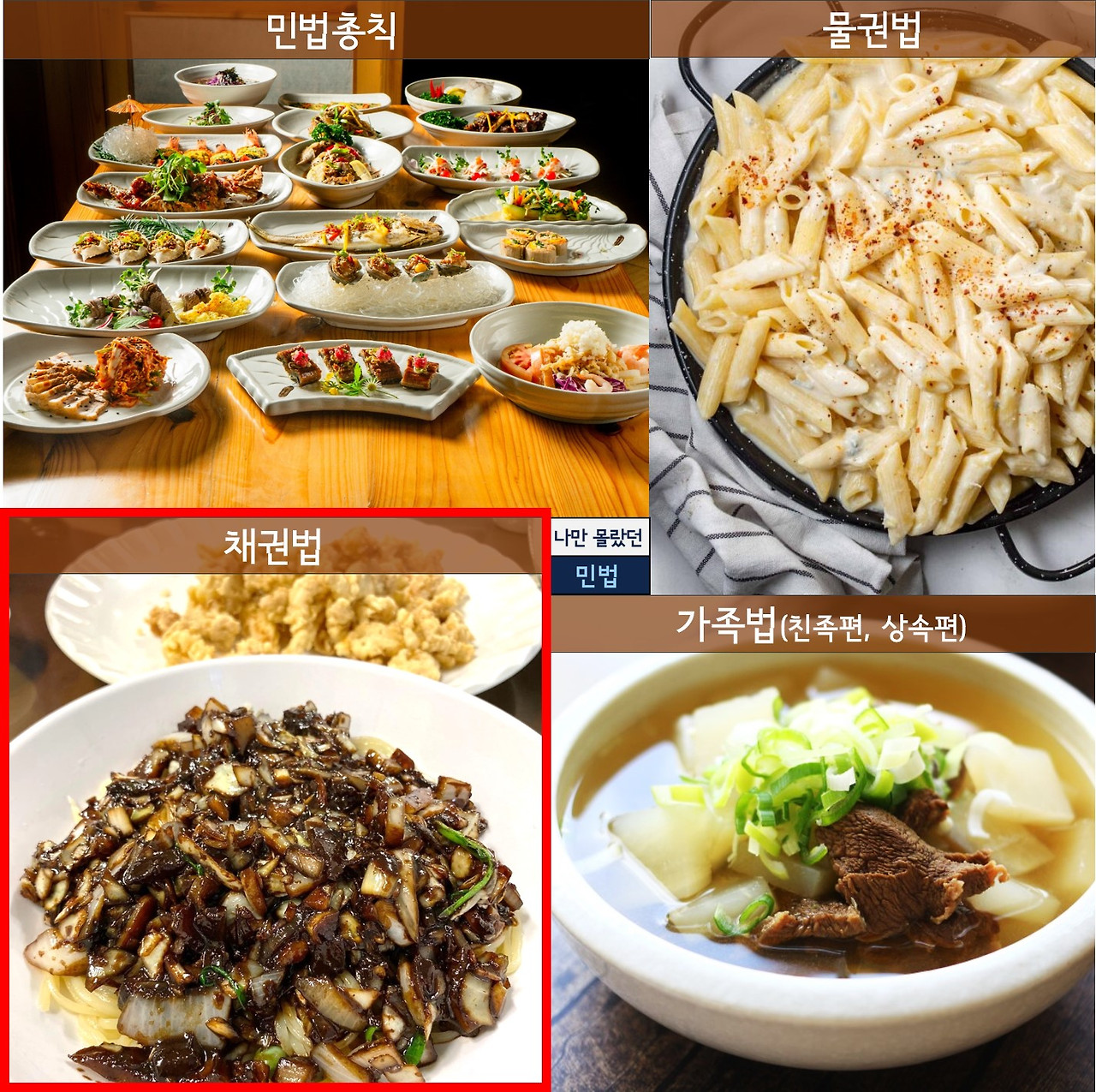 위 "민법의 맛: 4가지 요리"글에서도 설명을 드렸습니다만, 채권법은 "짜장면 + 탕수육 + 콜라" 같습니다. 우리에게 익숙한 개념들이라 이해하기 많이 어렵지는 않습니다만, "짜장면 + 탕수육 + 콜라"를 다 먹고 나면 많이 배가 부른 것처럼, 채권법도 상당한 양을 자랑합니다. 채권법 파트가 관련 민법 규정이 가장 많습니다.