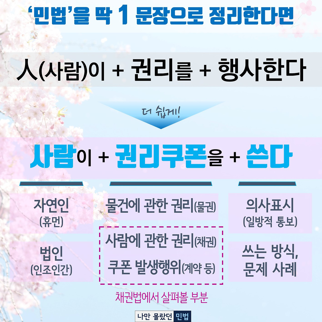법률 중에서도 가장 방대한 민법을 딱 1 문장으로 줄이면, "사람이 권리쿠폰을 쓴다."로 정리할 수 있습니다. 이 기본형 문장에 여러 변화와 옵션을 주면서 민법의 법리가 쌓이게 되는 것입니다.