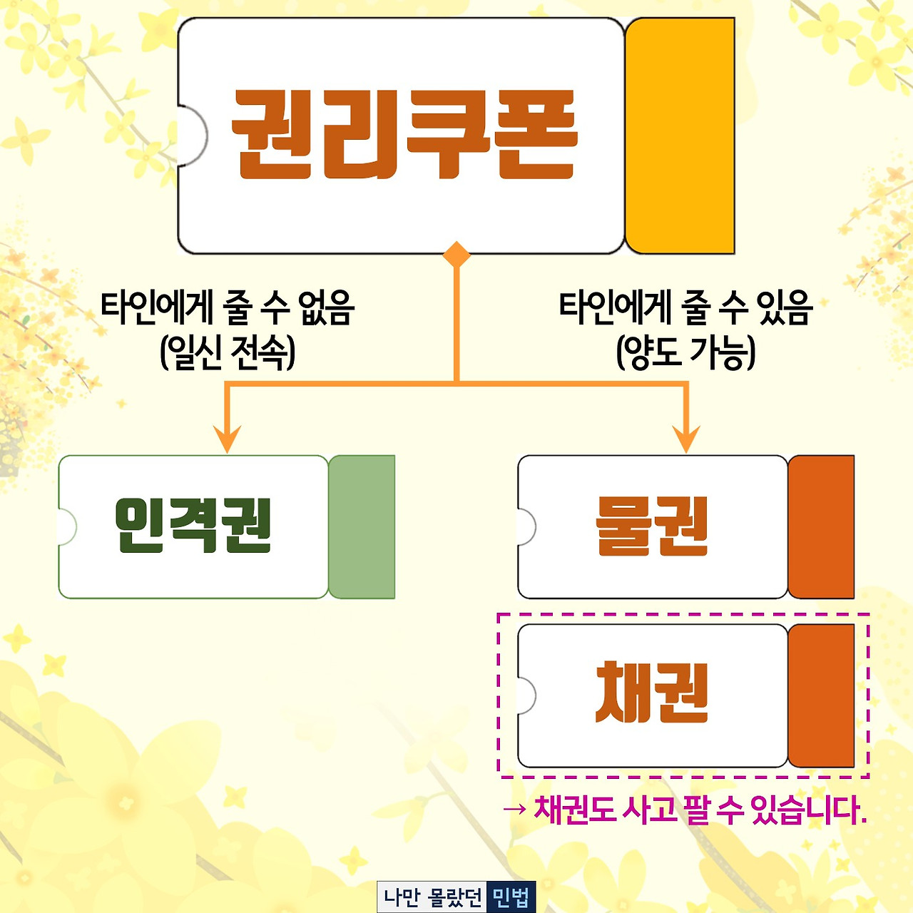 권리쿠폰은 타인에게 넘겨줄 수 없는 '인격권'과 타인에게 넘겨줄 수 있는 '재산권'으로 가장 먼저 구분됩니다. '재산권'은 다시 물건에 관한 권리(물권)와 사람에 관한 권리(채권)로 구분됩니다.