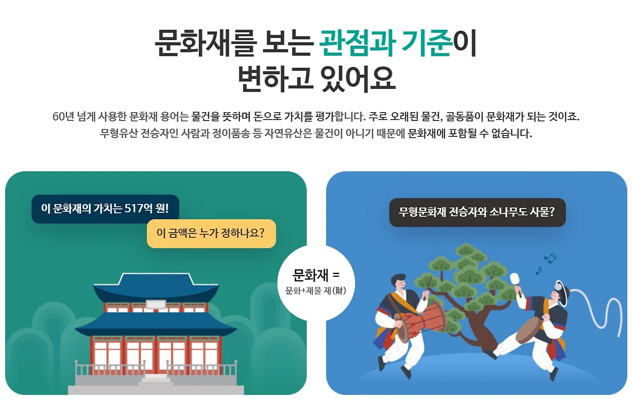 문화재를 보는 관점과 기준이 변하고 있고, 국제기준을 따라 변화에 대응할 필요가 있었습니다. 그래서 2023. 5. 16. 국가유산기본법이 제정되었고, 1년이 지난 2024. 5. 17. 국가유산기본법이 시행되었습니다.