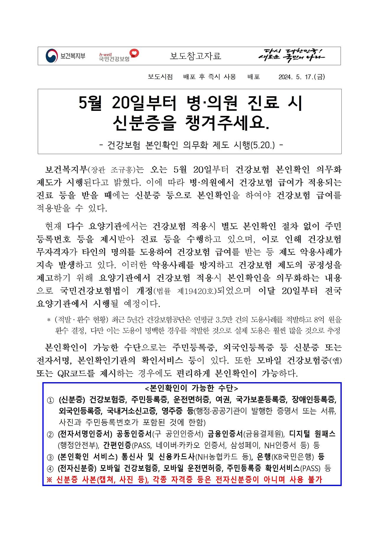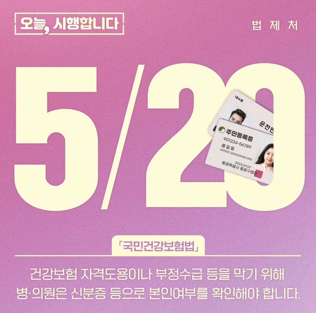 ④ 요양기관은 가입자 또는 피부양자에게 요양급여를 실시하는 경우 보건복지부령으로 정하는 바에 따라 건강보험증이나 신분증명서로 본인 여부 및 그 자격을 확인하여야 한다. 다만, 요양기관이 가입자 또는 피부양자의 본인 여부 및 그 자격을 확인하기 곤란한 경우로서 보건복지부령으로 정하는 정당한 사유가 있을 때에는 그러하지 아니하다. <신설 2023. 5. 19.> → 진료를 받을 사람은 "신분증"이나 "건강보험증"을 꼭 챙겨 가야한다는 말입니다.