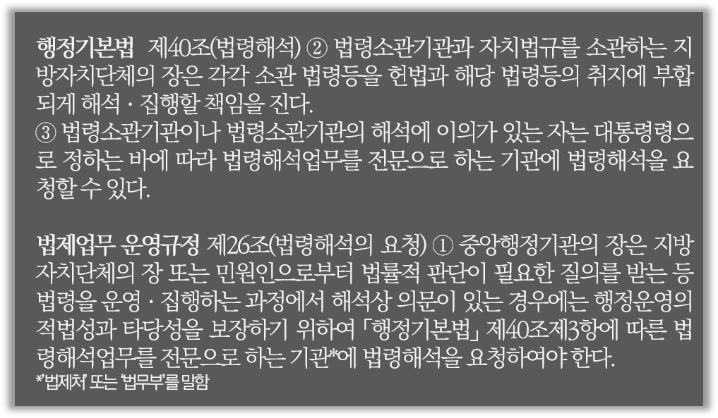 그 당시 나는 ‘사법부의 판단권한’만 알고 '행정부의 해석권한'은 제대로 알지 못했다. 무시했다라는 표현이 더 정확할지도 모르겠다. 법률 규정과 대법원 판례를 공부하기 바빴으니, 행정부의 ‘유권해석’이나 ‘질의회신’ 같은 것을 알지 못했고, 혹여 알았다고 하더라도 가볍게 여기고 넘어갔을 것이다. 그런데 행정기본법에서 '행정부의 해석권한과 책임'에 대하여 구체적으로 규정하고 있다. 이 정도는 알고 있어야 했다.