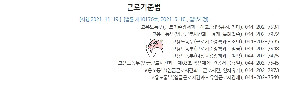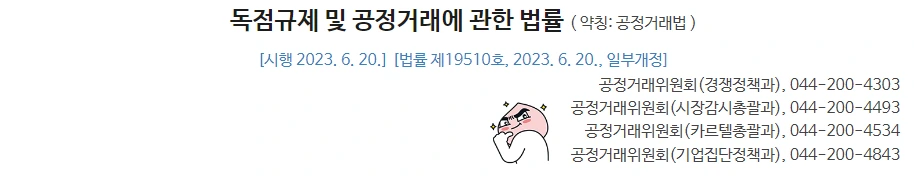 위와 같이, 독점규제 및 공정거래에 관한 법률의 해석권한은 공정거래위원회가, 근로기준법에 대한 해석권한은 고용노동부가, 행정기본법에 대한 해석권한은 법제처가 갖고 있다. 국가법령정보센터에서 법령을 검색하면 그 명칭 아래에 나와 있는 행정기관이 해석권한을 갖고 있는 곳이다(친절하게 부서와 전화번호도 있다).