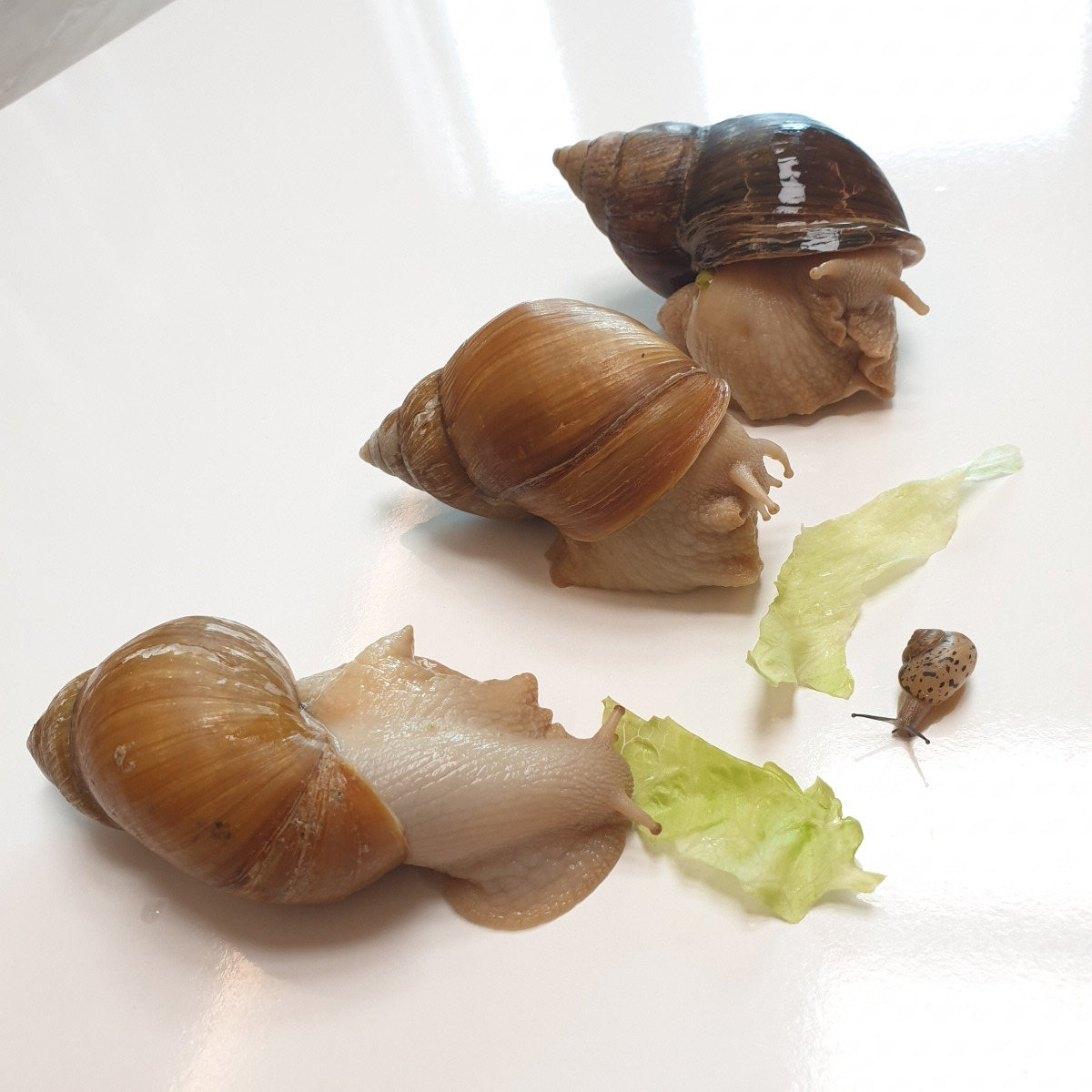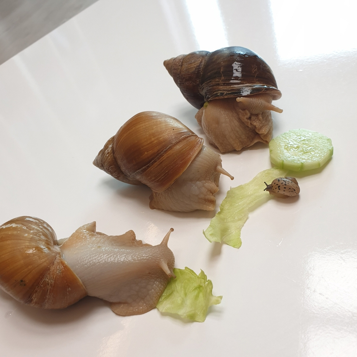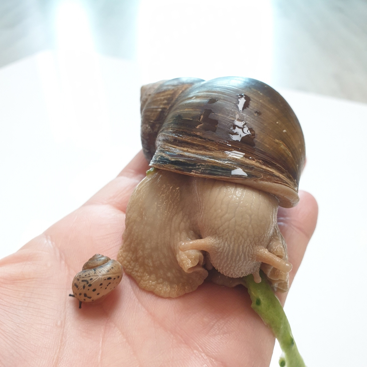 왼쪽의 큼직한 세 마리는 원래 조변과 함께 살고 있는 금와 달팽이(2마리)와 백와 달팽이(1마리)입니다. 금와달팽이와 백와달팽이는 외래종이자 생태계 교란종이라 함부로 방생할 수 없습니다.