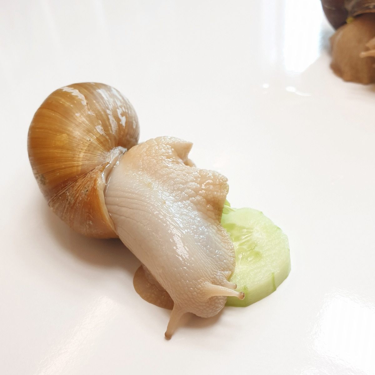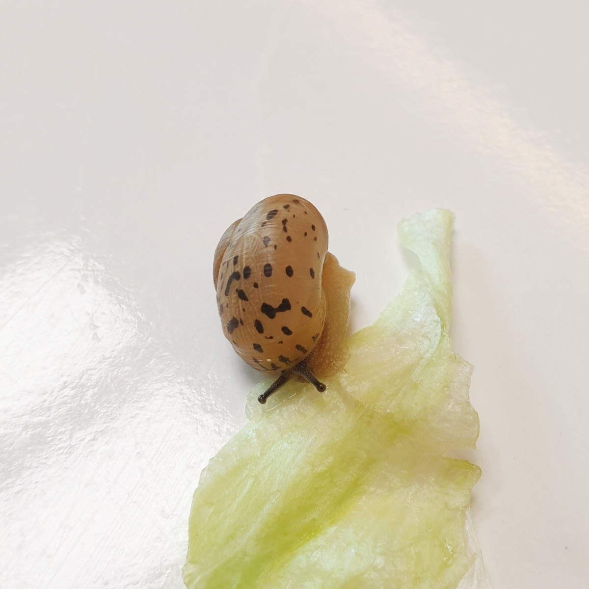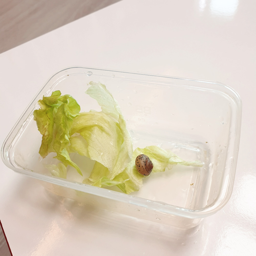 그리고 오른쪽에 작게 보이는 달팽이는 우리나라 토종 달팽이 "명주달팽이"입니다. 두 달 전에 아들과 함께 하교하는 길에 잠깐 보살펴주고자 데리고 왔습니다. 명주달팽이는 방생을 해도 되기 때문에 조금만 더 키워서 장마시즌에 방생을 할 예정입니다.