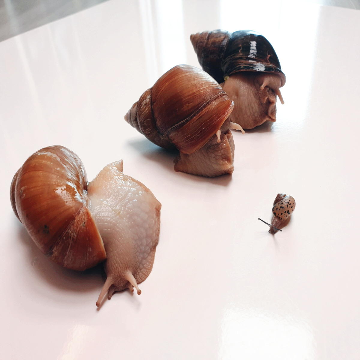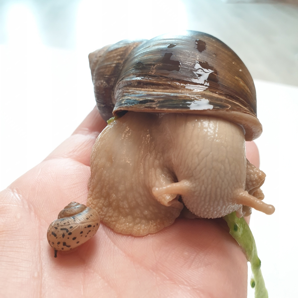크기 차이가 많이 나기 때문에 명주달팽이와 다른 달팽이들은 분리해서 키우고 있습니다. 백와달선생, 금와달선생들은 엄청나게 많이 먹고 또 엄청나게 많이 쌉니다. 그래서 집을 깨끗하게 청소했을 때만 사진을 찍을 수 있습니다.
