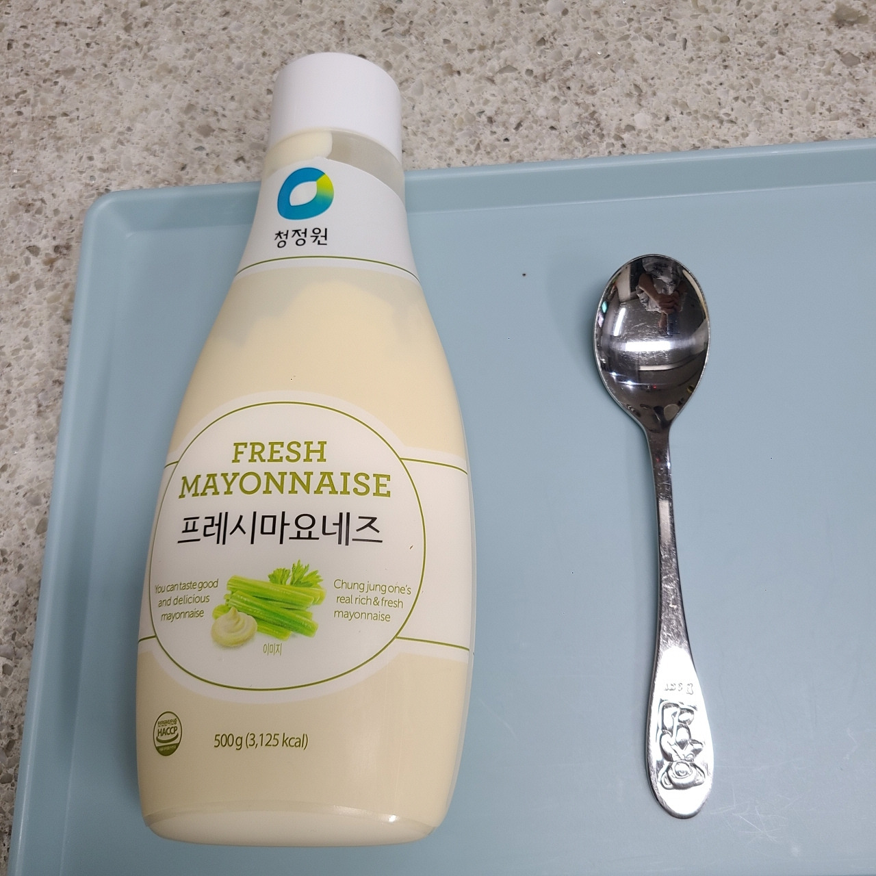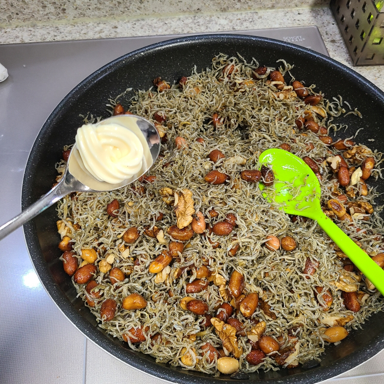 멸치볶음의 바삭한 식감을 유지하기 위하여 마요네즈를 1 숟갈 정도 투하하고, 또 열심히 저어줍니다.