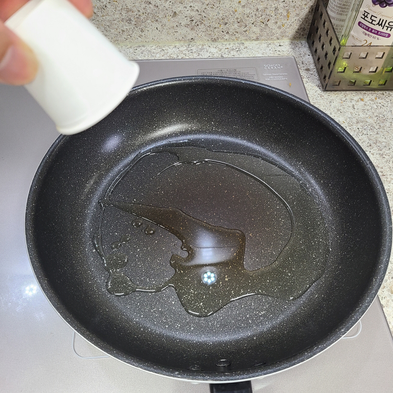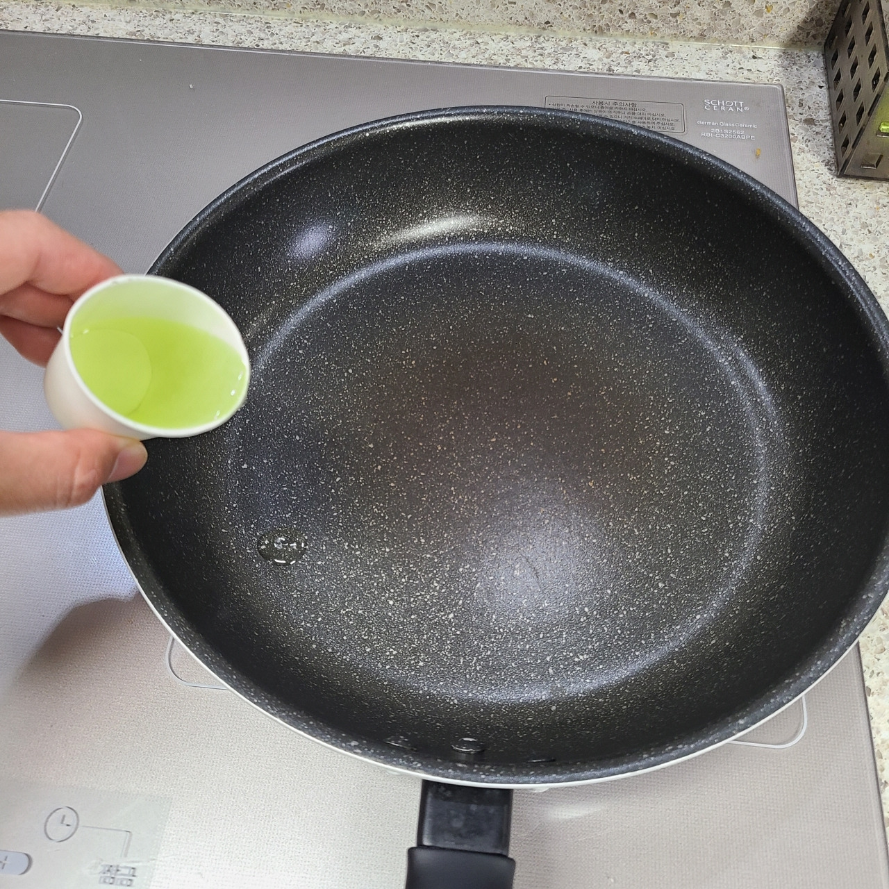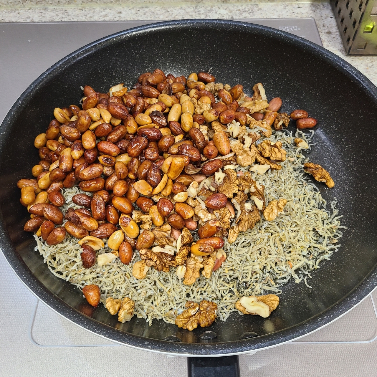 식용유는 소주컵 반컵 정도(3스푼)를 부어줍니다. 인덕션에 불을 6 정도(중불)로 올려줍니다. 그리고 멸치를 바로 부어줍니다. 땅콩과 호두도 함께 부어줍니다.