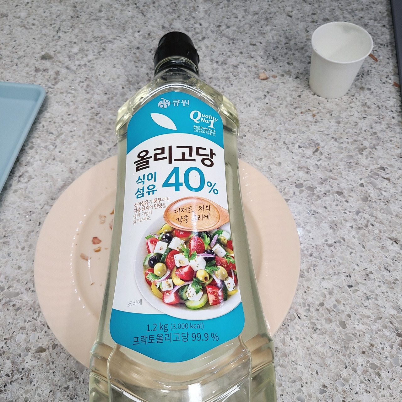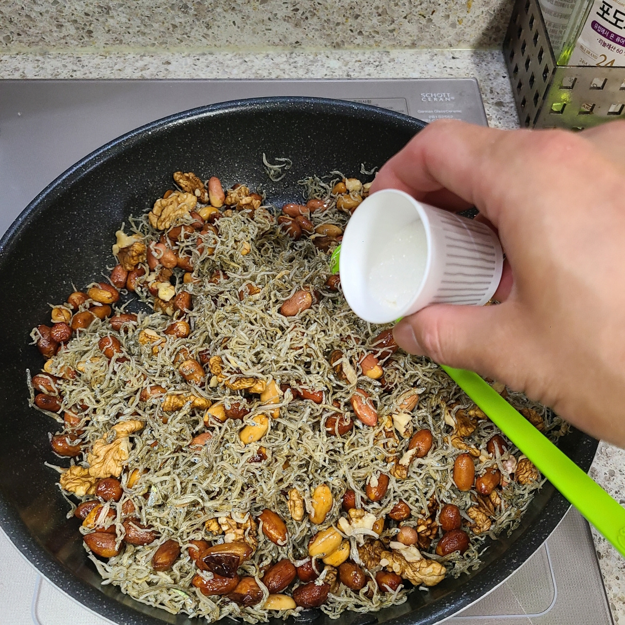 올리고당은 고열에서 단맛이 사라진다고 합니다. 그래서 잘 식은 멸치볶음 위에 올리고당으로 큰 동그라미 두 줄을 그려주듯이 부어줍니다. 이후 마지막으로 다시 한번 더 잘 섞어줍니다.