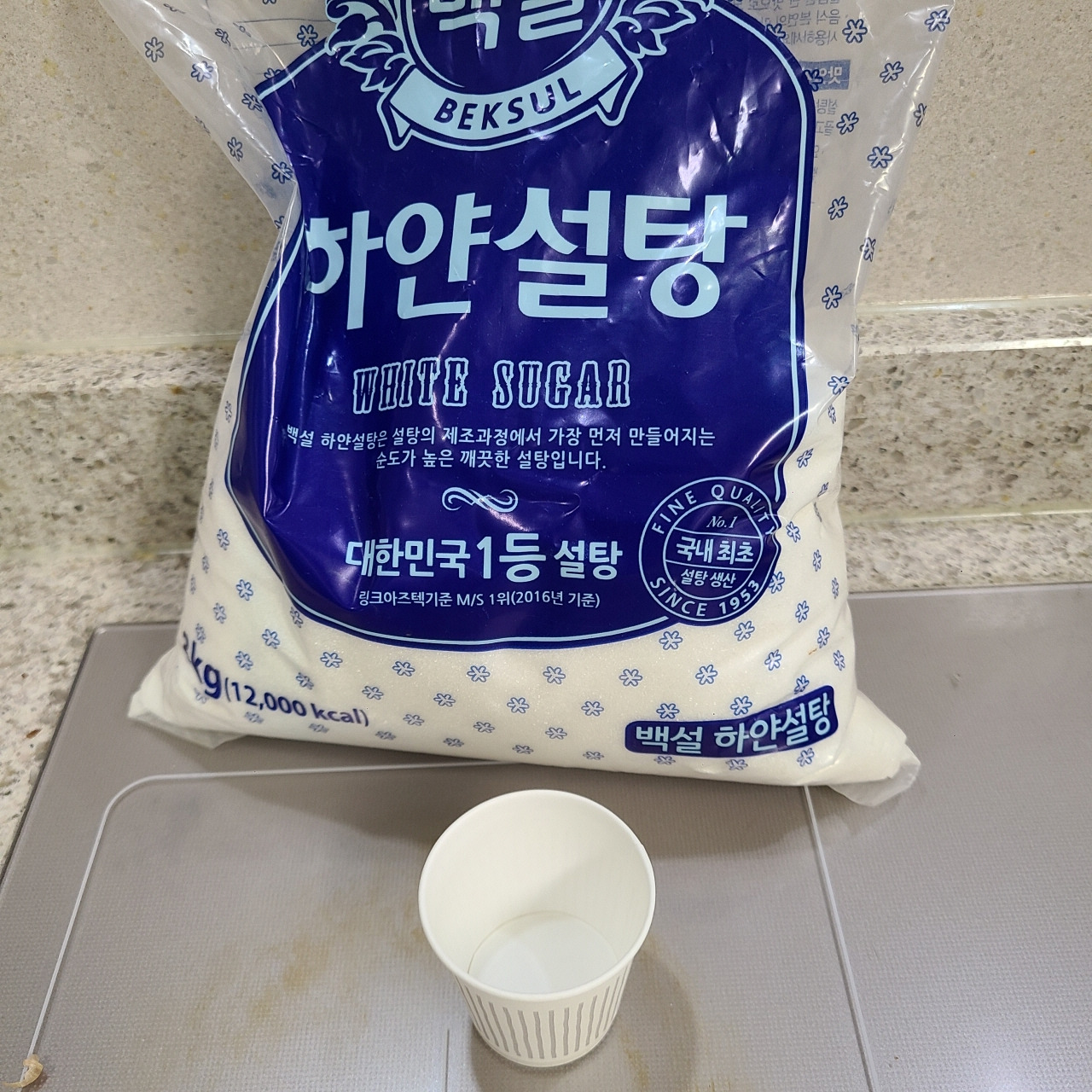 어느 정도 잘 섞였다 싶으면, 다음에 설탕을 소주 1/4컵 정도 부어줍니다. 마지막에 다 식혀서 올리고당을 조금 더 부어줄 예정이기 때문에, 설탕을 조금 섭섭할 정도로 약간만 부어주고 다시 열심히 저어줍니다.