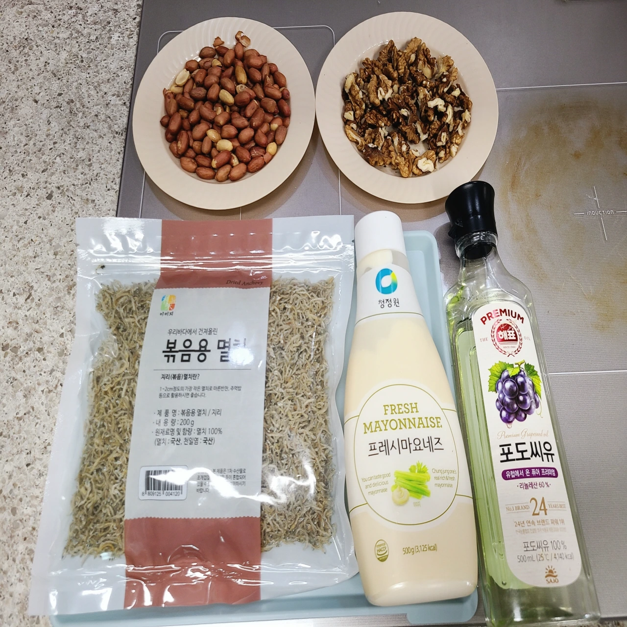 볶음용 멸치는 쿠팡에서 8천 원 정도 주고 구매했습니다. 세멸치 한 봉지에 200g인데, 큰 프라이팬이 꽉 찰 정도로 많습니다. 200g이라는 분량이 결코 적지 않습니다. 냉장고에 있던 볶음 땅콩, 냉동실에 잠자고 있던 깐 호두도 같이 준비합니다. 식용유와 마요네즈도 함께 준비합니다.