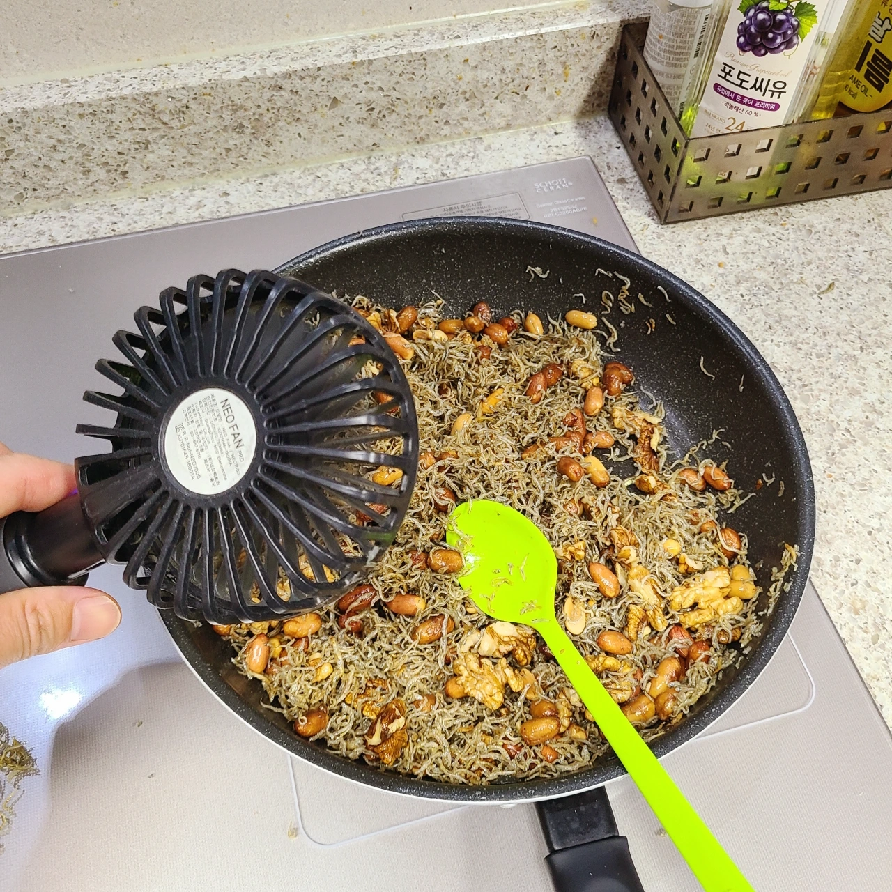 그리고 다 볶은 멸치볶음에 남아있는 열과 수분을 빨리 날려버리는 것도 중요합니다. 선풍기로 날려줍니다.