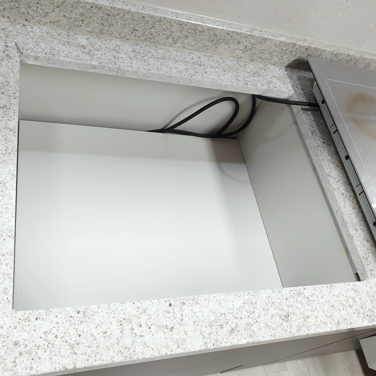 가스오븐용 전기 콘센트가 있는데, 거기에 플러그를 연결하고 타공 위치에 쏙 넣으면 설치가 끝납니다.