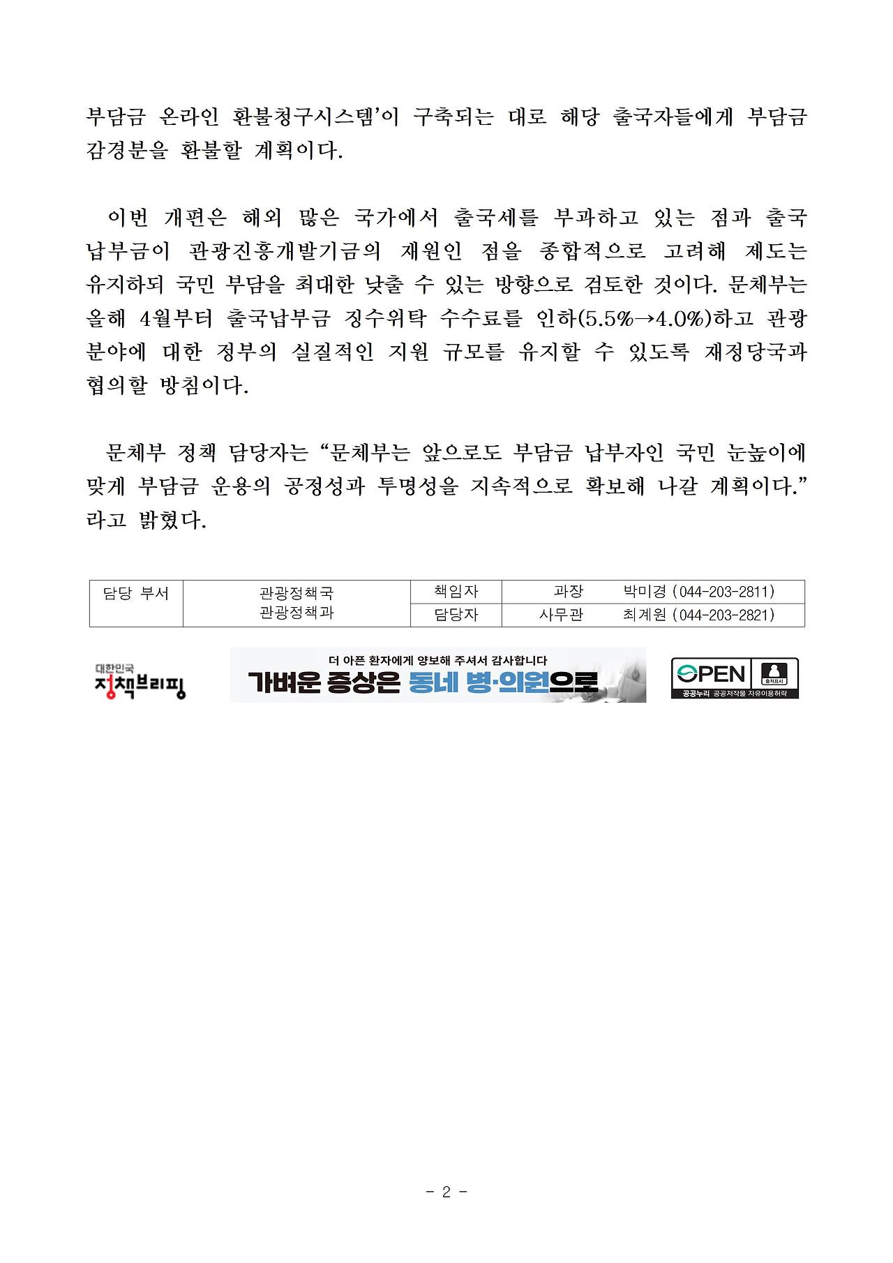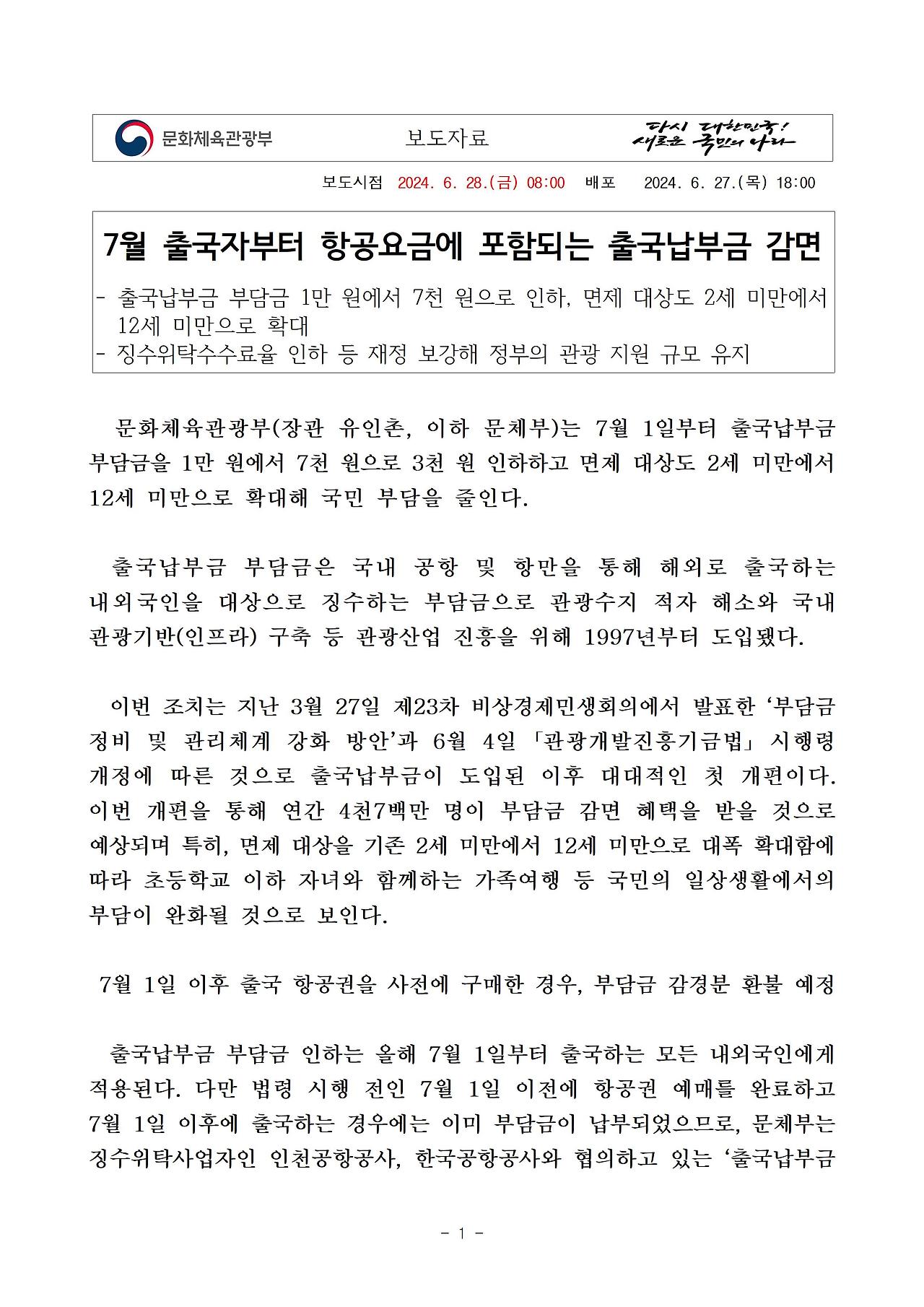 실생활과 밀접한 부담금의 감면을 통해 국민의 경제적 부담을 완화하기 위해 공항을 통하여 출국하는 사람에 대한 출국납부금의 금액을 1만원에서 7천원으로 인하하고, 해당 출국납부금의 면제 대상을 2세 미만의 어린이에서 12세 미만의 어린이로 확대하는 것으로 관광진흥개발기금법 시행령 제1조의2가 개정되었습니다.