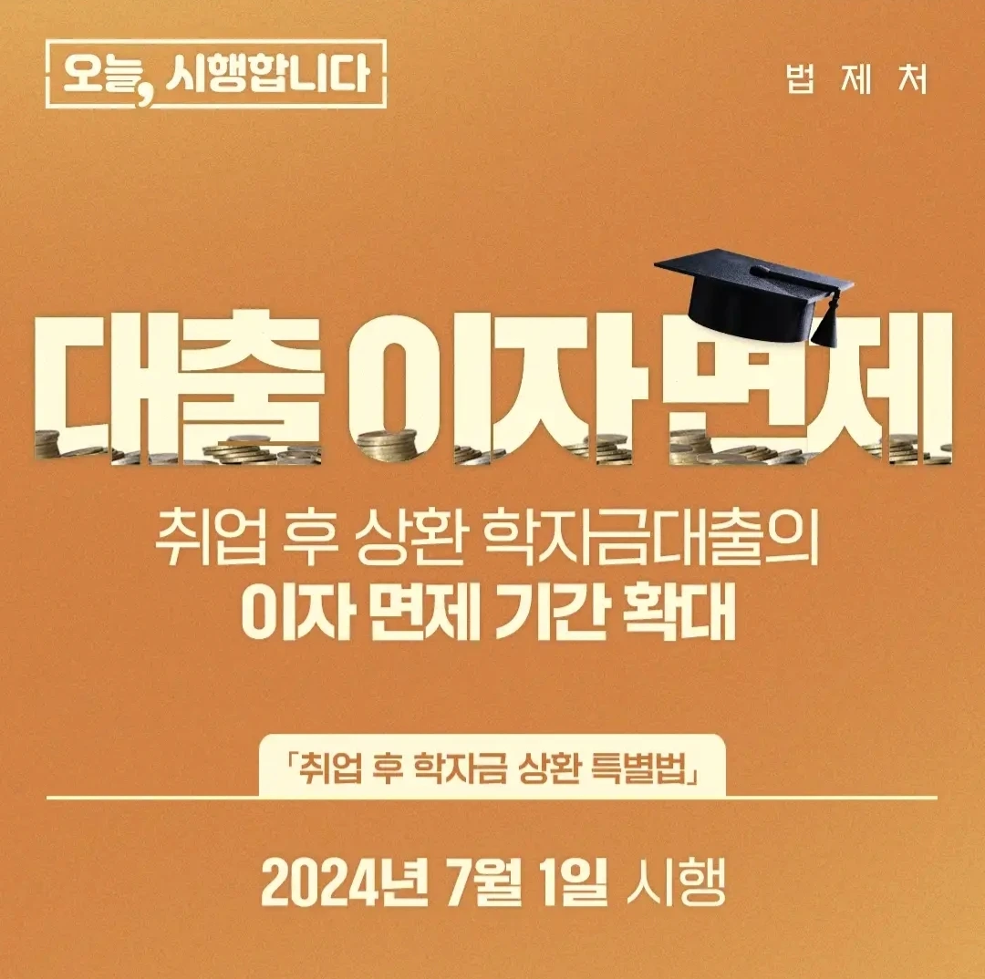 '취업 후 학자금 상환 특별법' 제16조의2 제2항이 개정되면서, 1) 기초, 차상위 및 다자녀 가구의 대학생의 이자 면제 기간을 '재학기간'에서 '취업 후 의무상환 시작 전(일정한 수준의 소득이 발생하기 전)'까지로 확대하고, 2) 기준 중위소득 100% 이하(학자금지원 1~5구간) 가구의 대학생에 대해서는 졸업 후 2년 범위 내에서 이자를 면제하는 내용이 신설되었습니다.