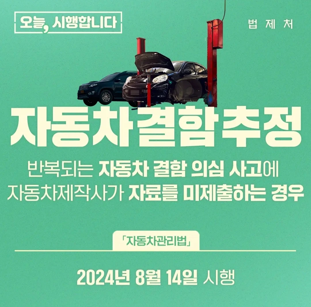 개정된 자동차관리법이 8월 14일 시행되면서, 자동차의 장치가 운전자 의도와 다르게 작동해 사고가 반복적으로 발생했을 때 자동차제작사나 부품제조사가 결함 조사에 필요한 자료를 제출하지 않으면 자동차 결함으로 추정할 수 있게 되었습니다. 제조사 책임을 한층 강화하기 위한 입법 조치입니다.