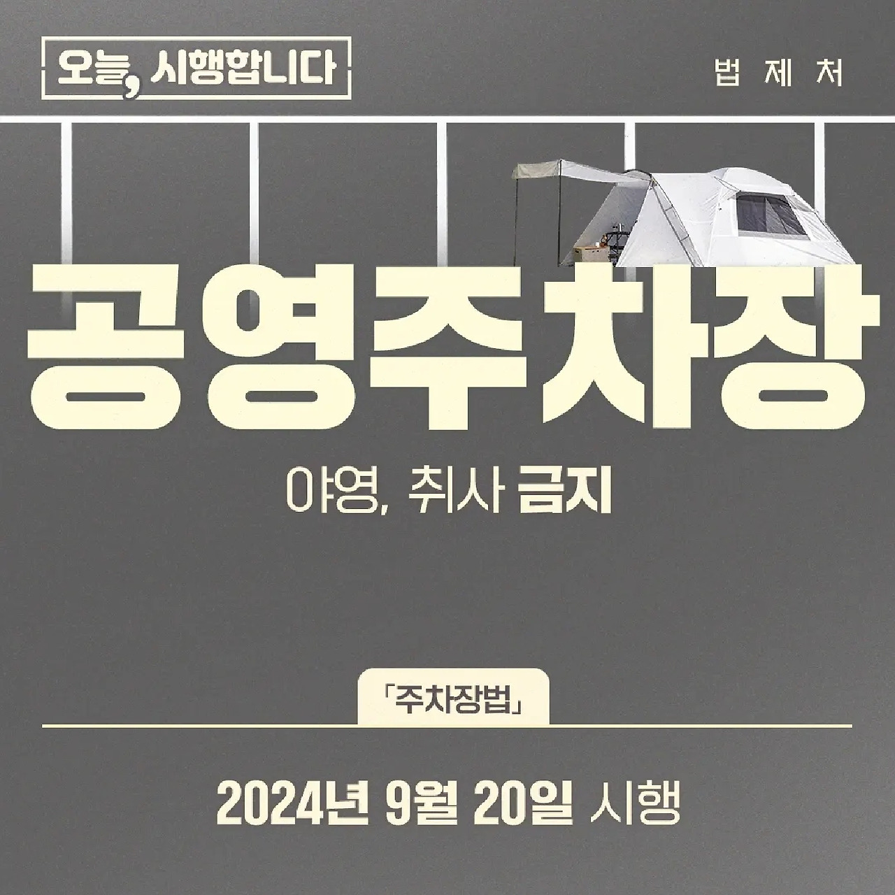 주차장법 개정에 따라, 공영 주차장에서 야영, 취사 또는 불을 피우는 행위가 금지됩니다. 1차 위반 시 30만 원, 2차 위반 시 40만 원, 3차 이상 위반 시 50만 원의 과태료가 부과됩니다.