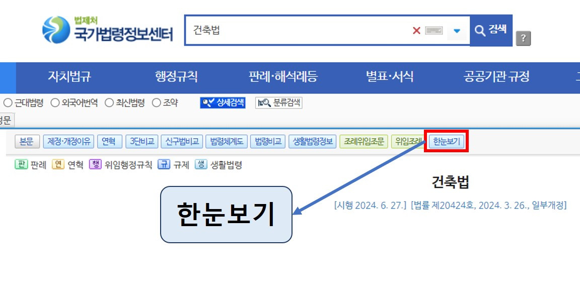 한눈에 이해되는 법령정보는 국가법령정보센터(https://www.law.go.kr/LSW/main.html)에서 아래와 같은 방법으로 확인할 수 있습니다. "한눈보기" 아이콘을 클릭하면 관련 이미지를 찾아볼 수 있습니다.
