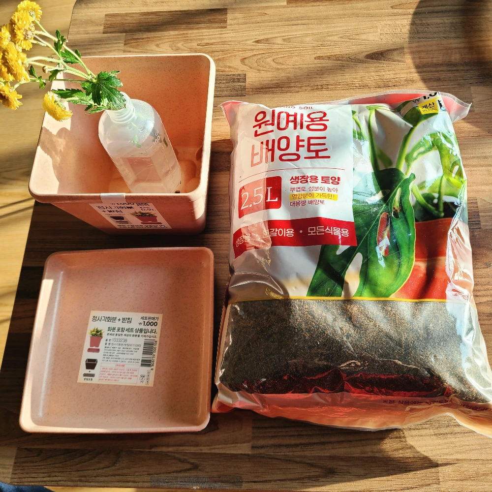 화분+받침 세트 1천 원, 원예용 배양토 1천 원에 구입했습니다.