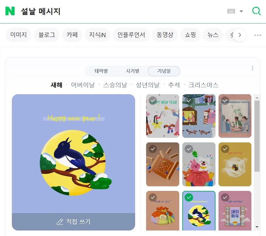 네이버 검색 창에 "설날 메시지"로 검색을 하면 아래와 같이 이미지 메시지를 작성할 수 있습니다.