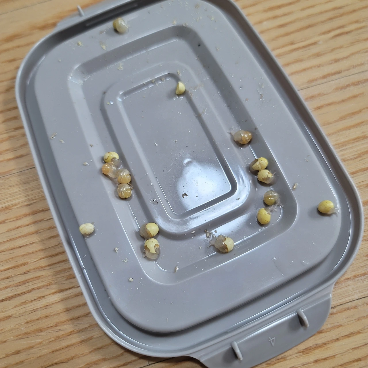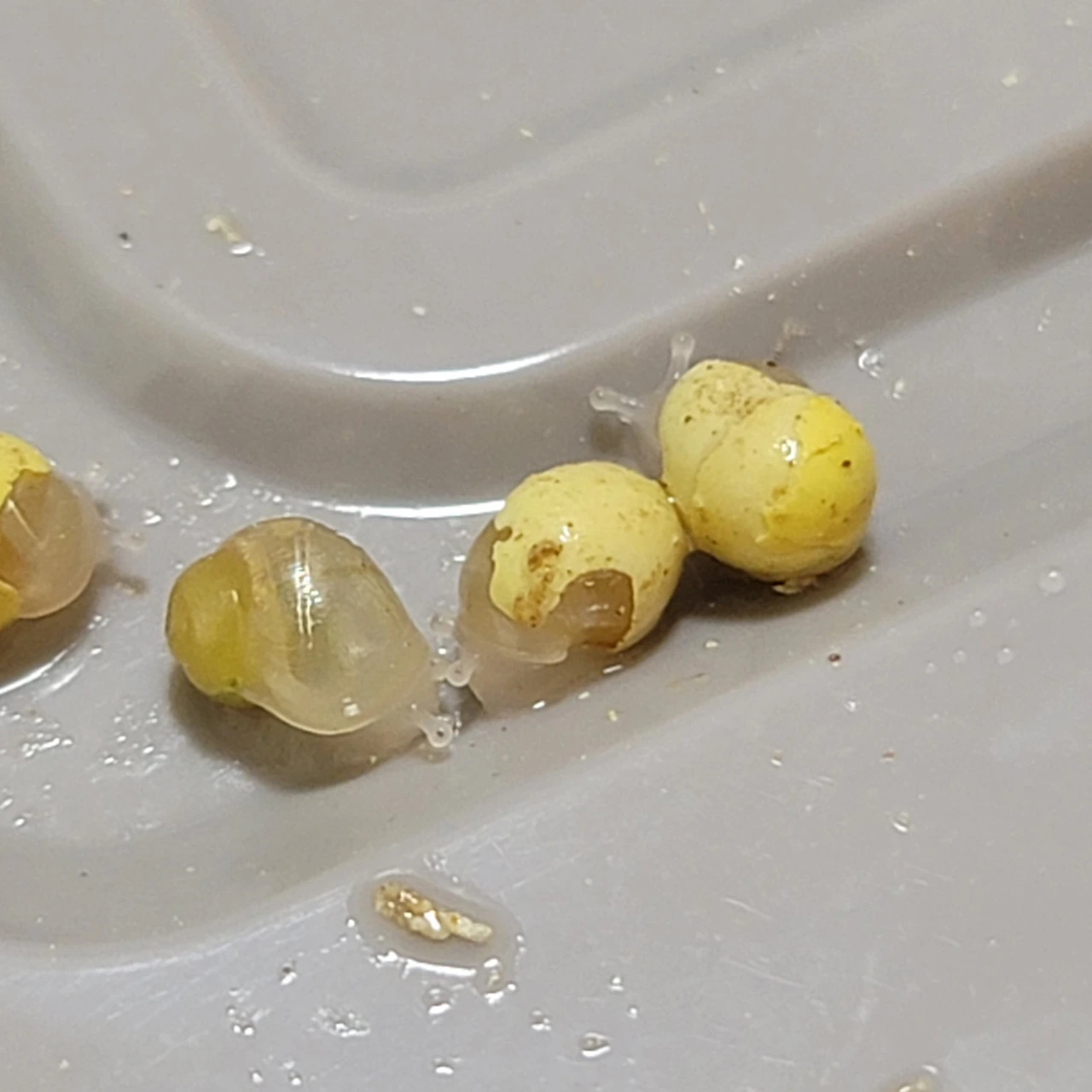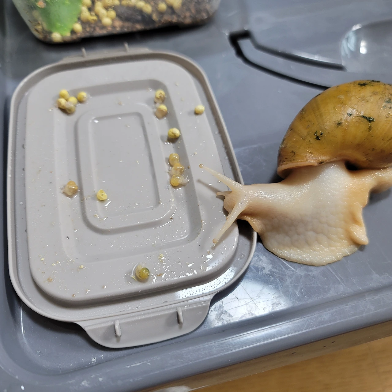 오늘 아침에 부화했나 뚜껑을 열어보니 갓 부화한 아기달팽이들이 뚜껑에 붙어있었습니다.