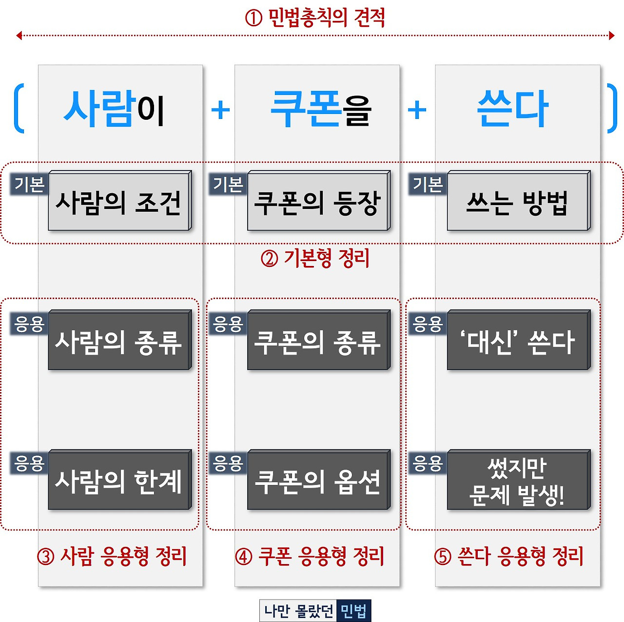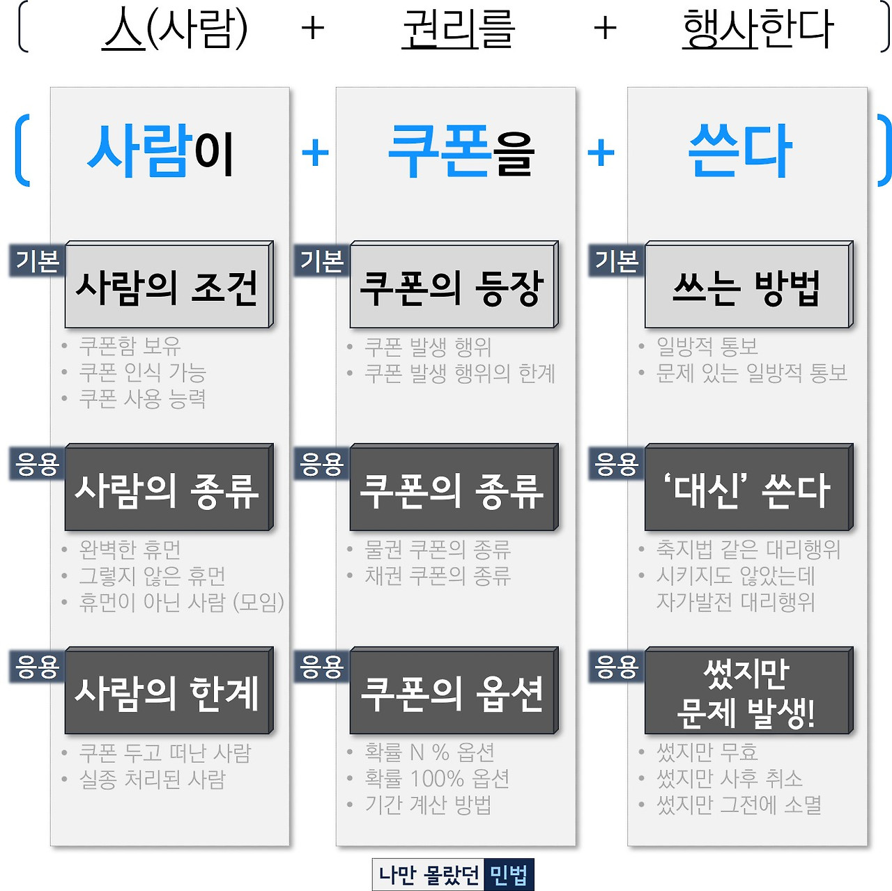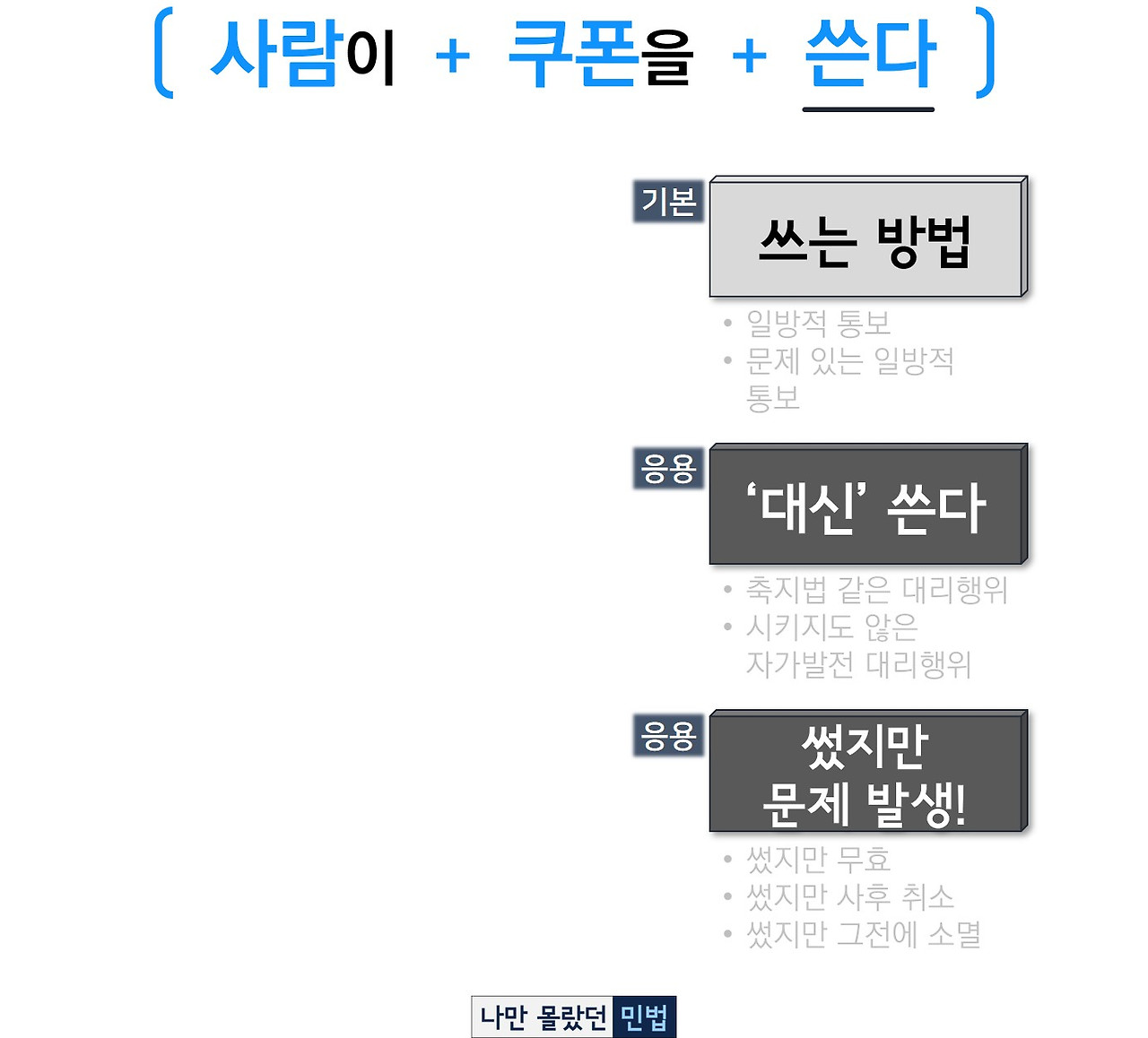 앞으로 배울 ② ~ ⑤ 시간에서는 민법총칙의 기본적인 내용을 쉬운 말로 이해한 후, 어려운 법률 용어와 매칭하는 것까지 하겠습니다(예: 쿠폰함권리능력, 일방적 통보의사표시). 그래야 이를 토대로 조금 더 어려운 민법공부를 하실 수 있습니다(다른 민법책에는 '쿠폰함'과 같은 말이 나오지 않기 때문이지요).