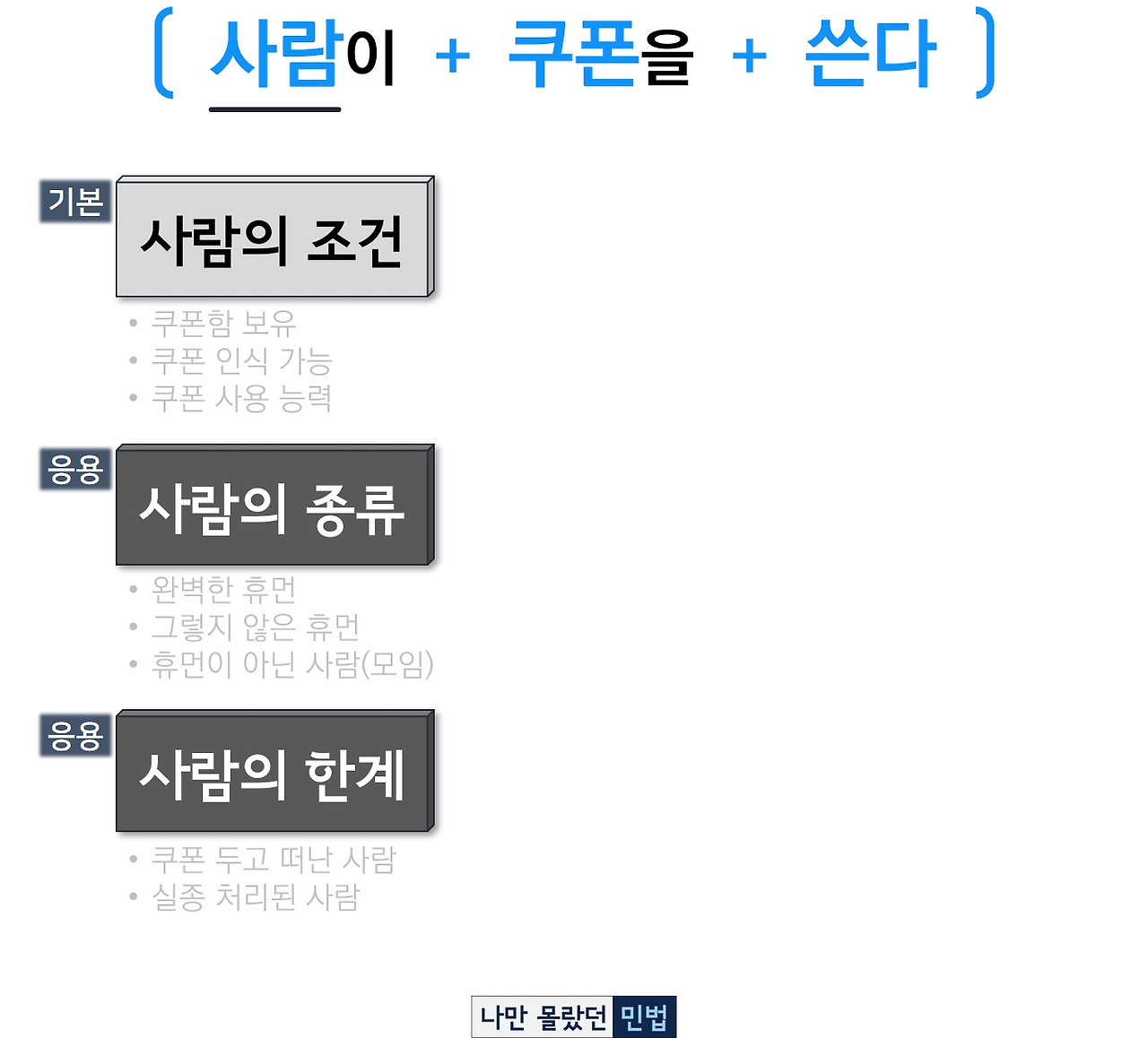 제가 반복해서 말씀드린 민법의 핵심인 "권리"에 관한 설명입니다. "사람이 권리를 행사한다."라는 심플한 문장에서 민법은 출발합니다. 조금 더 쉬운 말로 바꾸면, "사람이 쿠폰을 쓴다."와 같은 느낌으로 이해할 수 있습니다. '사람이라는 존재가 쿠폰과 같은 권리를 쓴다'로 이해하시면 조금 더 정확합니다.