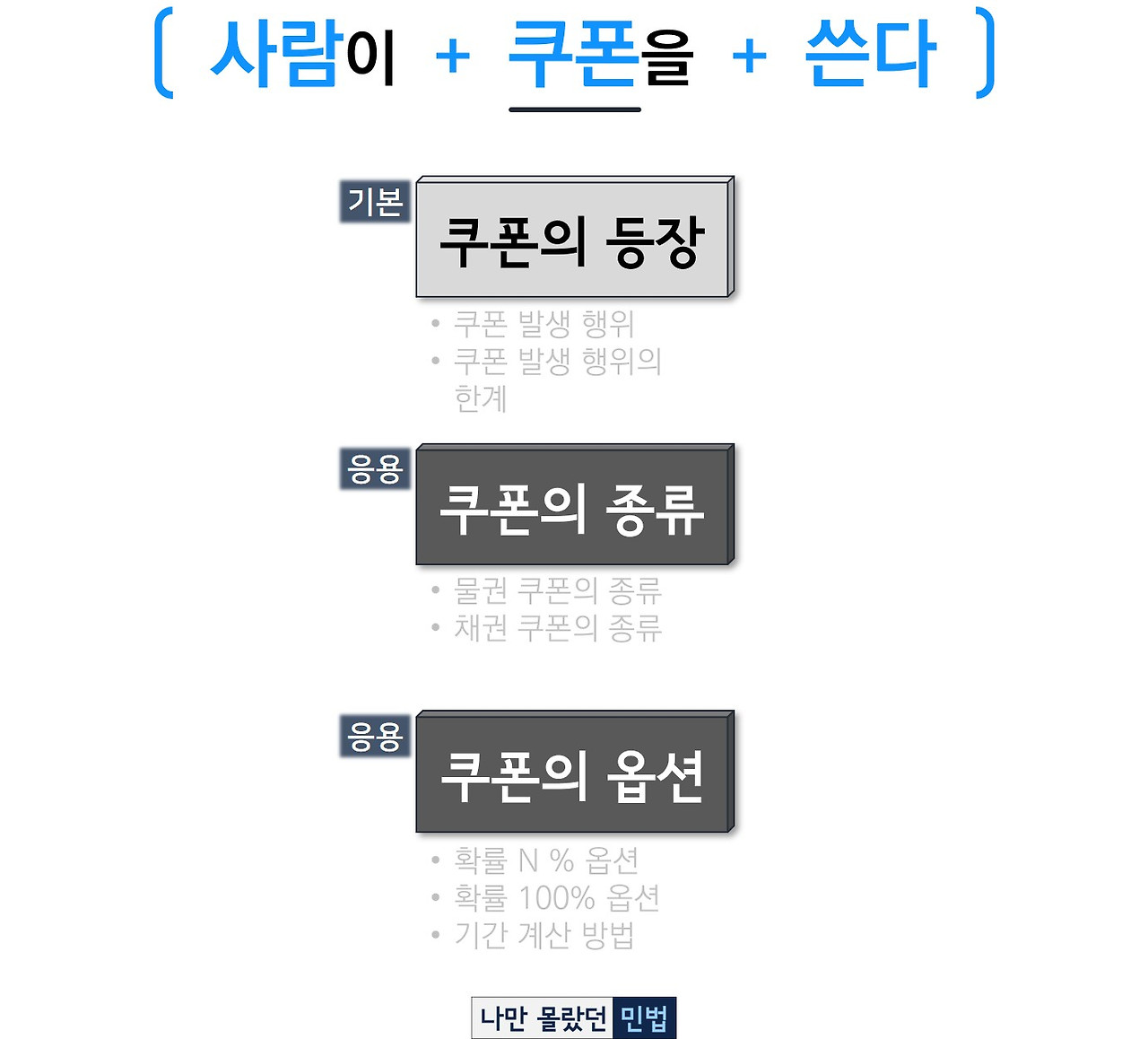 "쿠폰"의 견적은 "쿠폰의 등장", "쿠폰의 종류", "쿠폰의 옵션"으로 잡아볼 수 있습니다. "쿠폰의 등장"에서는 사람이라는 존재가 쿠폰을 만들어내는 방식(어려운 말로 '법률행위')을 살펴봅니다. "쿠폰의 종류"에서는 물권 쿠폰과 채권 쿠폰을 다룰 텐데, 구체적인 내용은 물권법과 채권법에서 배울 것입니다.