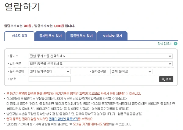 대법원 인터넷등기소(http://www.iros.go.kr/)를 활용하여 내가 사업을 영위하고자 하는 장소가 속한 지역에 동일, 유사한 상호가 있는 지 확인해보아야 한다. 유사한 상호를 사용하는 것을 방지하기 위해 최대한 다양한 방법과 조합으로 검색하는 것을 추천한다.