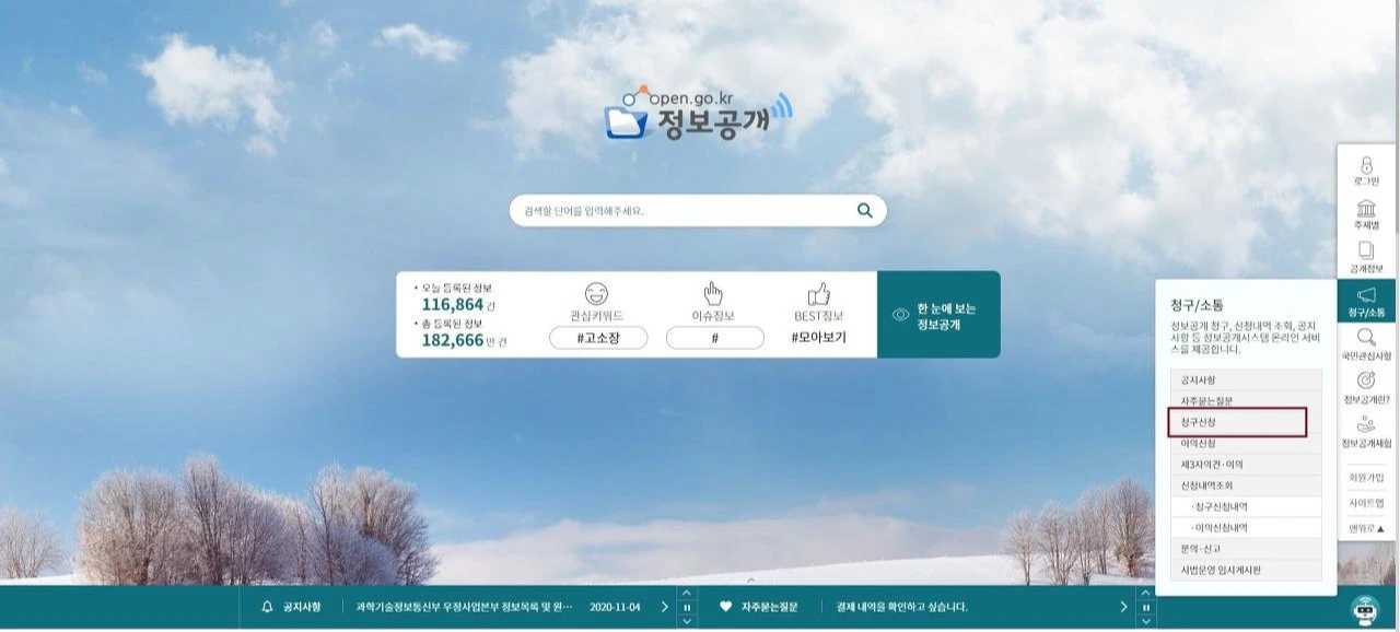 1. 정보공개 포털 사이트(www. open.go.kr)로 들어가서 정보공개를 신청
