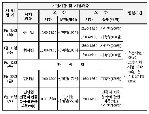 변호사시험 운영에 대해 좀 설명해보려고 한다. 변시는 매 해 1월 둘째 주 화요일부터 토요일까지 5일간 치러진다. 그중 하루는 휴식일이니 시험을 치는 것은 4일 정도이다. 처음 이 사실을 알면 놀라는 이들이 많다. 그도 그럴게, 많은 고시들이 있지만 이렇게 긴 시간 동안 시험을 치르는 경우는, 내가 알기론 별로 없다(행정고시 2차 시험 또한 5일 동안 치러진다는데, 시험을 치는 시간 자체는 변호사시험이 좀 더 길다).