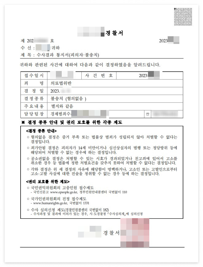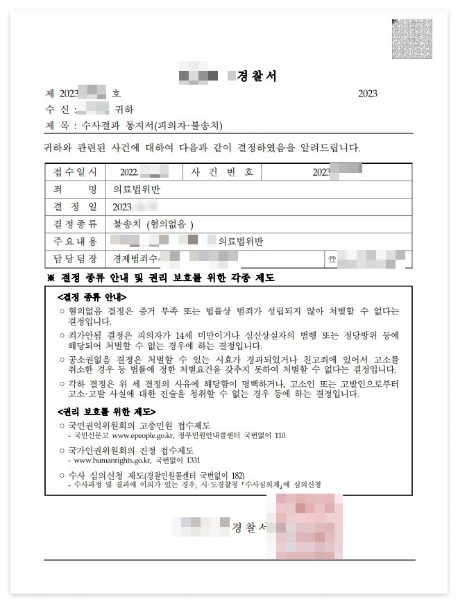 결국 나머지 피의자에 대한 조사는 생략을 한 채, 두 피의자의 모든 혐의에 대하여 혐의없음 불송치결정이 내려지게 되었다.