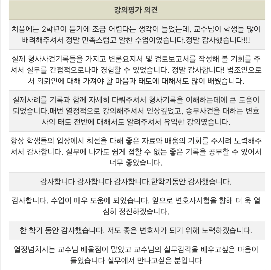 단순히 지식과 법 기술만을 가르치는 것이 아니라, 변호사로서의 마음가짐과 자세, 우리가 추구해야 할 가치와 덕목에 대해서도 나눌 수 있는 시간이 되기를 소망한다.